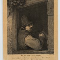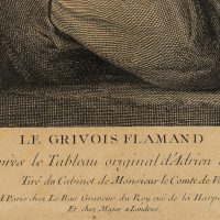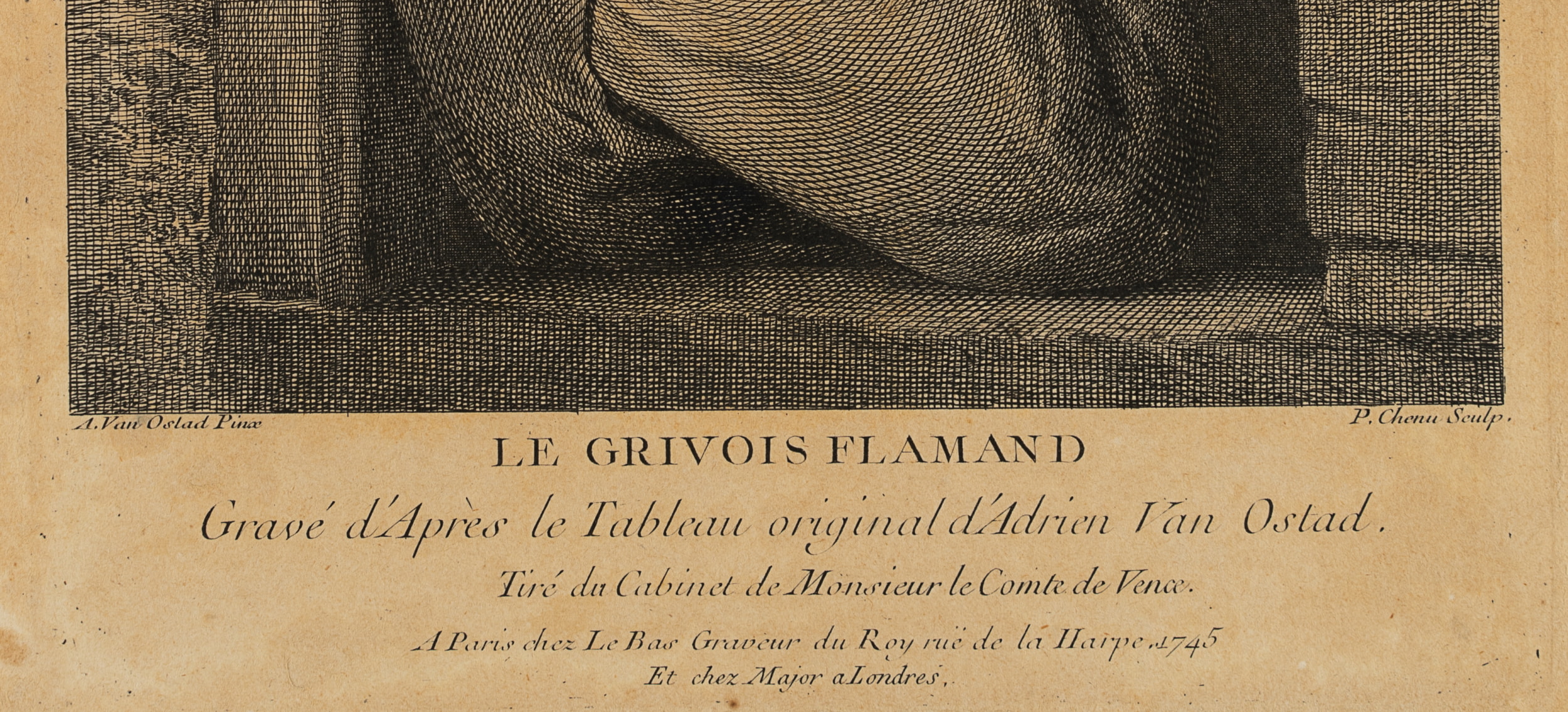 - Inscription: At the lower part signed in the printing plate: “A. Van Ostad Pinx / P. Chenu Sculp.”. Lower middle inscribed in the printing plate: “Gravé d’Après le Tableau original d’Adrien Van Ostad / Tiré du Cabinet de Monsieur le Comte de Vence / A Paris chez Le Bas, Graveur du Roy, rue de la Harpe. 1745 / et chez Major a Londres.”. Lower right dated: “1745”. Verso further inscription: “Paal”.