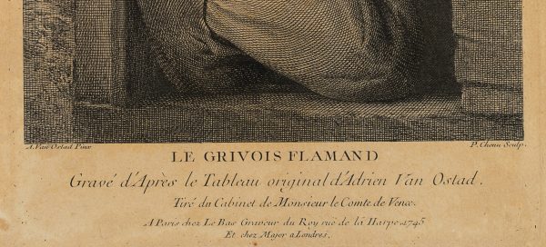 - Bezeichnung: Unten im Druck signiert: “A. Van Ostad Pinx / P. Chenu Sculp.”. Unten rechts datiert: “1745”. Unten mittig im Druck bezeichnet: “Gravé d’Après le Tableau original d’Adrien Van Ostad / Tiré du Cabinet de Monsieur le Comte de Vence / A Paris chez Le Bas, Graveur du Roy, rue de la Harpe. 1745 / et chez Major a Londres.”. Verso weitere Beschriftungen: “Paal”.