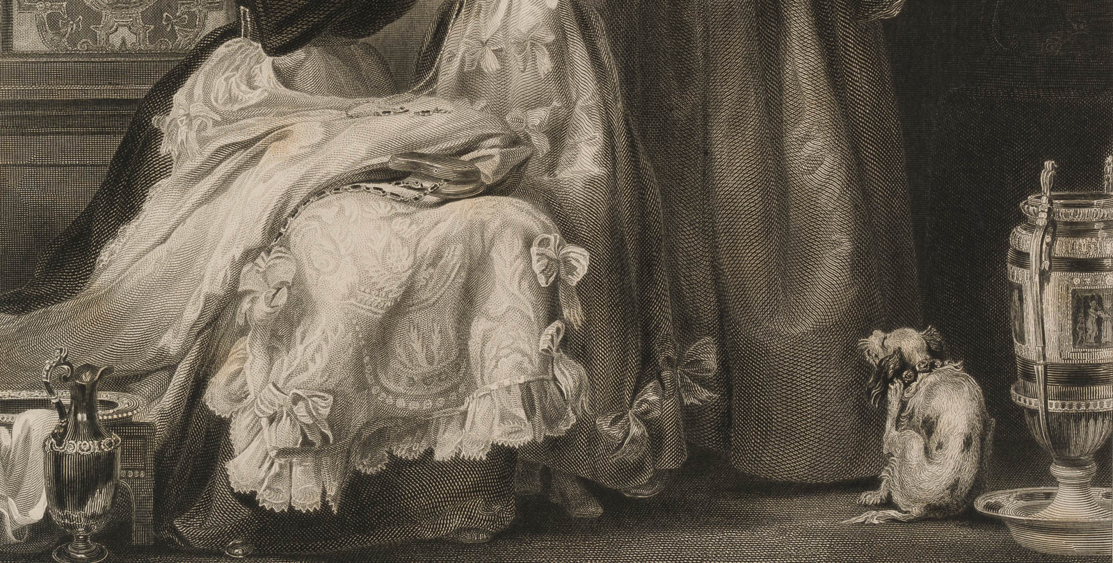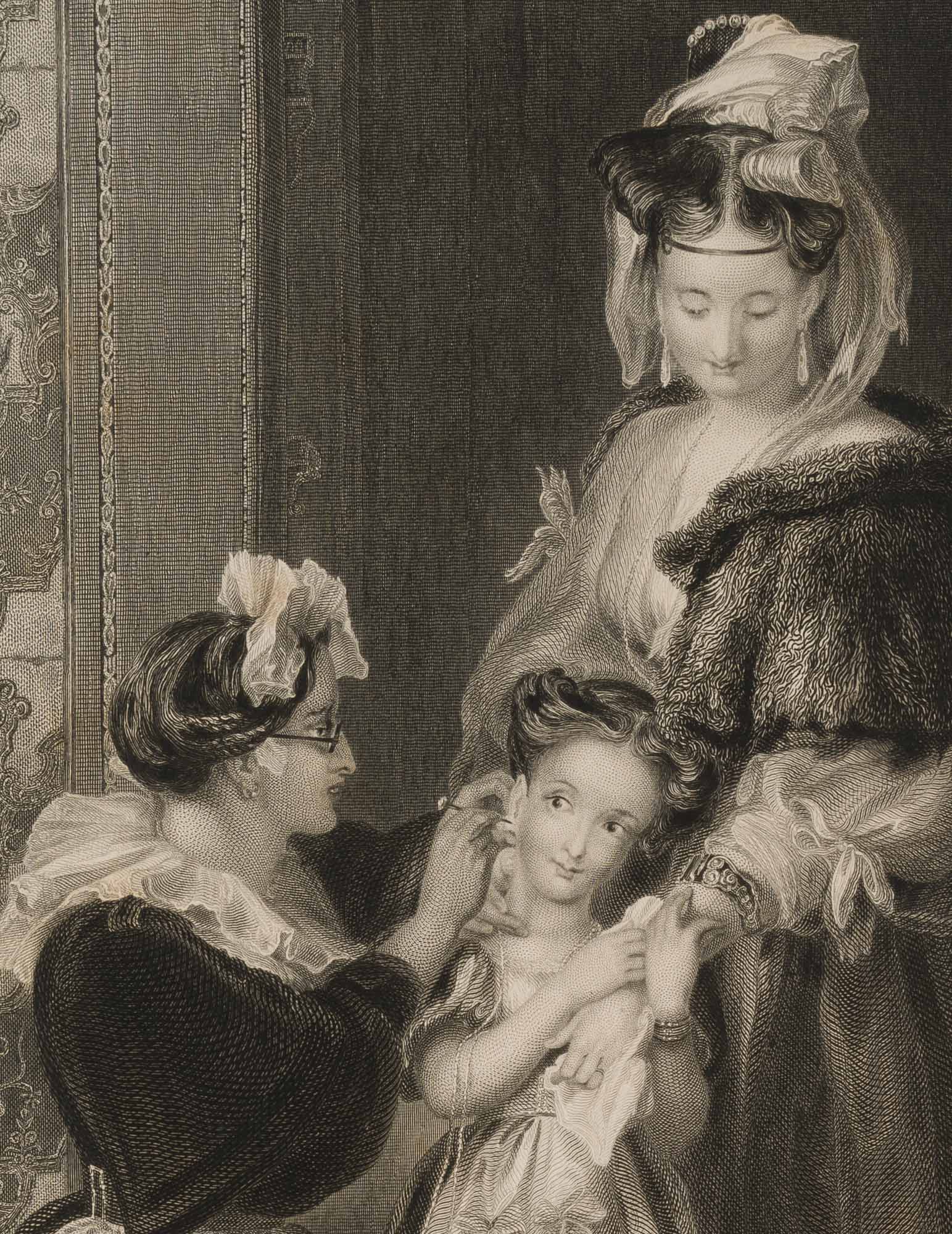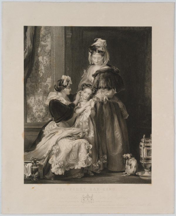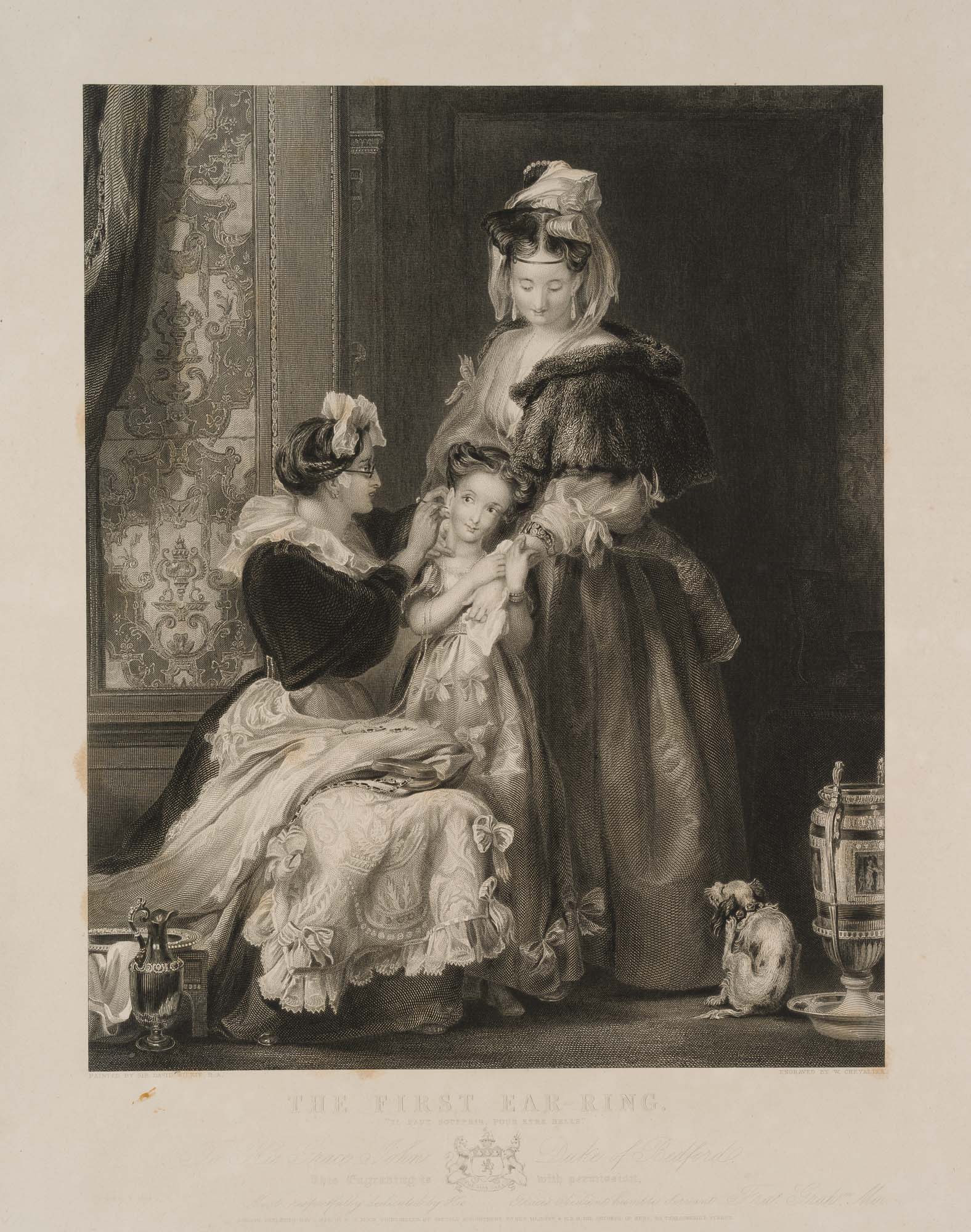Inscribed below the image within the printing plate with title, dedication and production details: ‘Painted by Sir David Wilkie R.A. / Egraved by W. Chevalier’, ‘”The first ear-ring. Il faut souffrir, pour être belle’ / To his Grace John Duke of Bedford / This engraving is with permission most respectfully dedicated by his graces obedient humble servant F.G. MOON” and publication line: “London Published May 1838 by G. Moon, printseller”. - Keywords: 19th century, Romanticism, Costumes, United Kingdom,