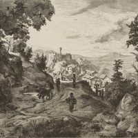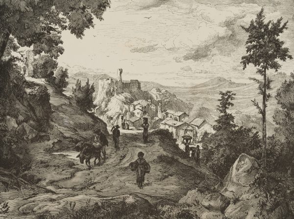 - Description: View of the picturesque town of Olevano on the ridge of the Monti Prenestini in the distance from an elevated rocky woodland with a path busy with wandering country folk.
