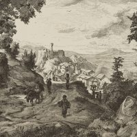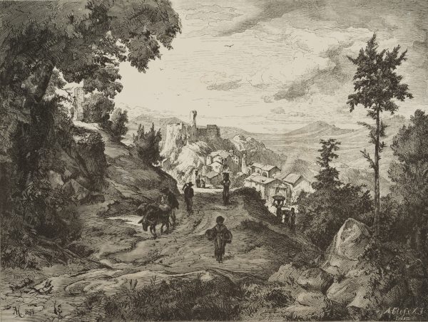 Adolf Closs (1840 Stuttgart – 1894 ibid.) after Albert Hertel (1843 Berlin – 1912 ibid.), Veduta of Olevano View of the town on the rock from a distance, 1876, Wood engraving