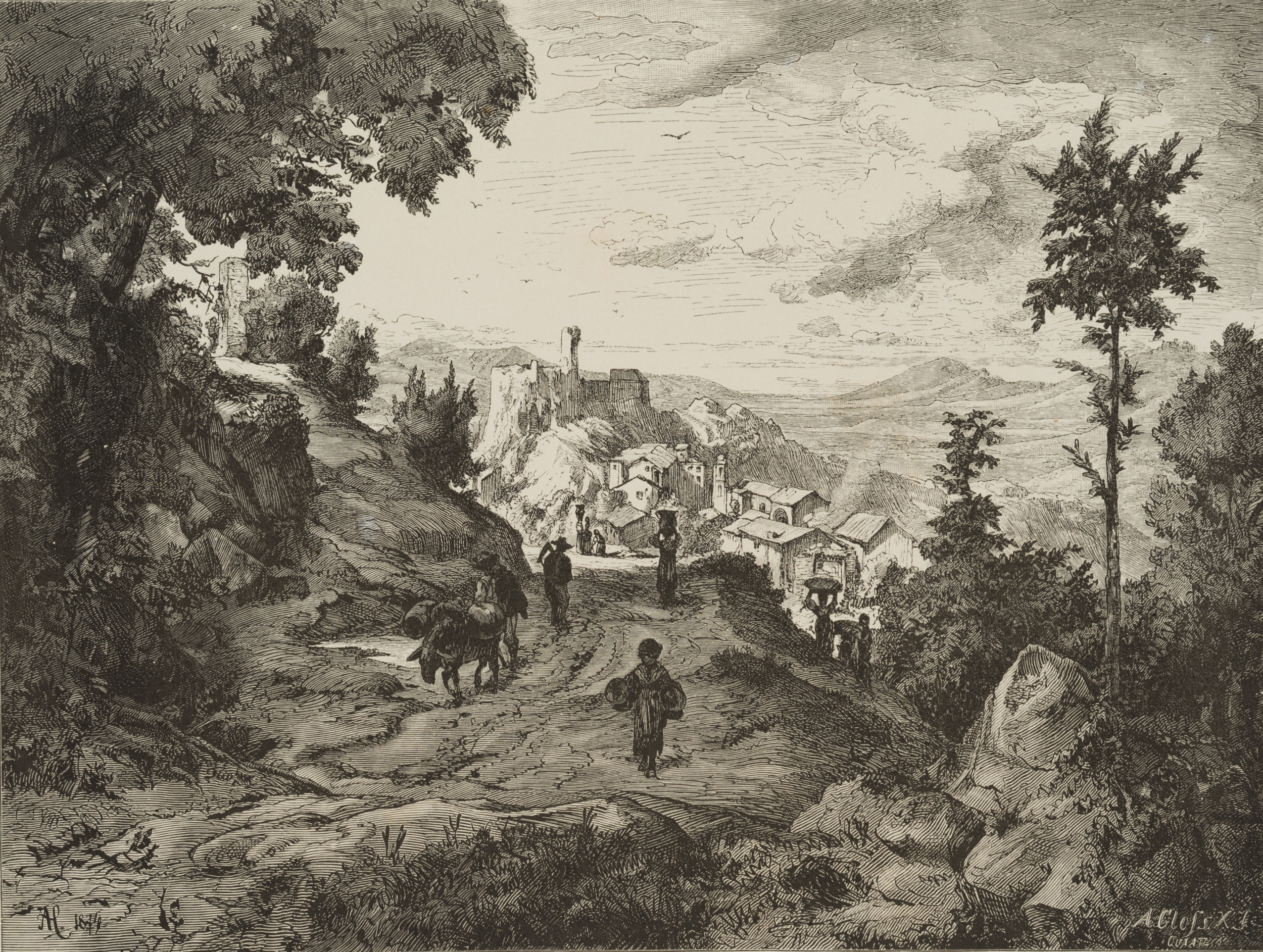 - Beschreibung: Blick von einem erhöhten felsigen Waldstück mit einem von wandernden Landleuten belebten Weg auf die sich in der Fernsicht befindenden pittoresken Stadt Olevano auf dem Bergrücken der Monti Prenestini