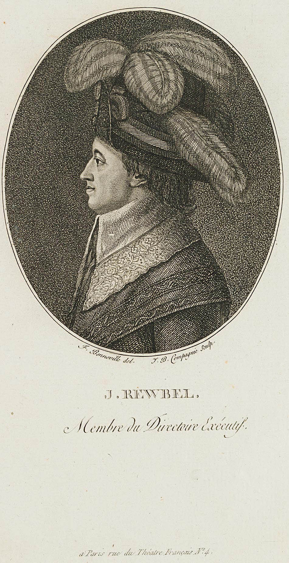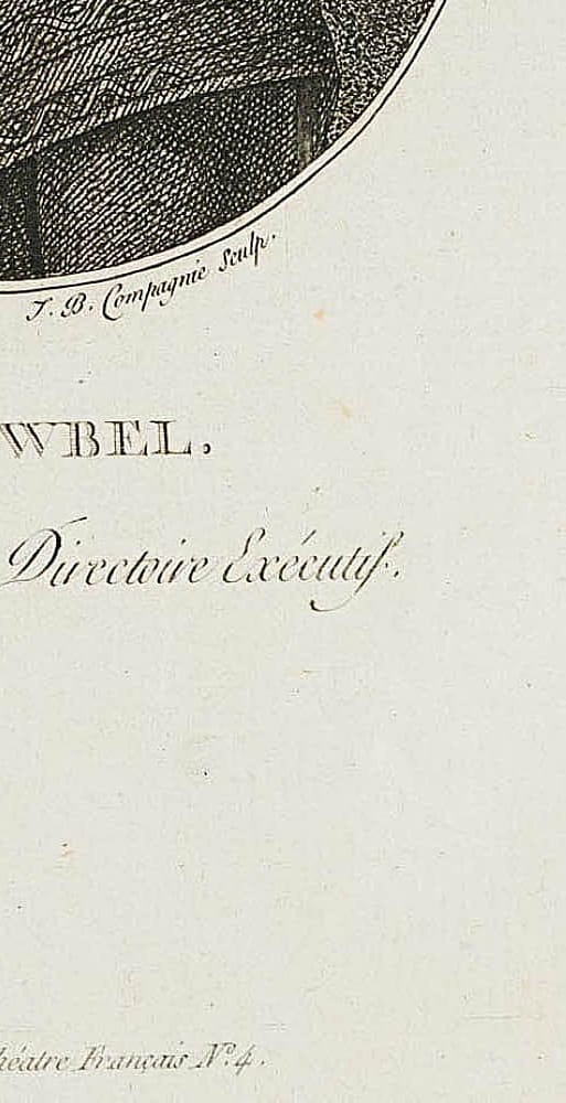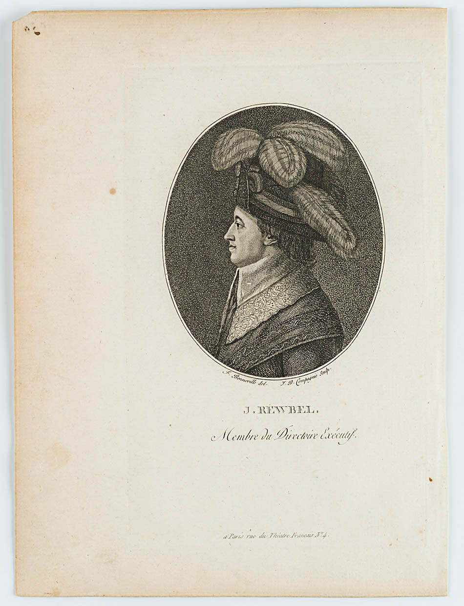 - Inscription: Signed on the left under the picture “F. Bonneville del.”, on the right next to it “J. B. Compagnie Sculp.”, below with the name of the sitter “J. REWBEL. Membre du Directoire Exécutif.” inscribed below.