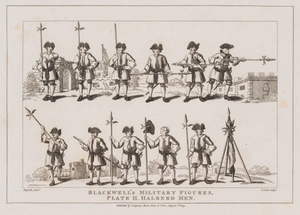 Thomas Cook (um 1744 – 1818 ebd.) nach William Hogarth (1697 London – 1764 ebd.), Blackwell’s Military Figures, Halberd Men, Illustration von militärischen Übungen der Infanterie, Helebardenträger, 1809, Radierung