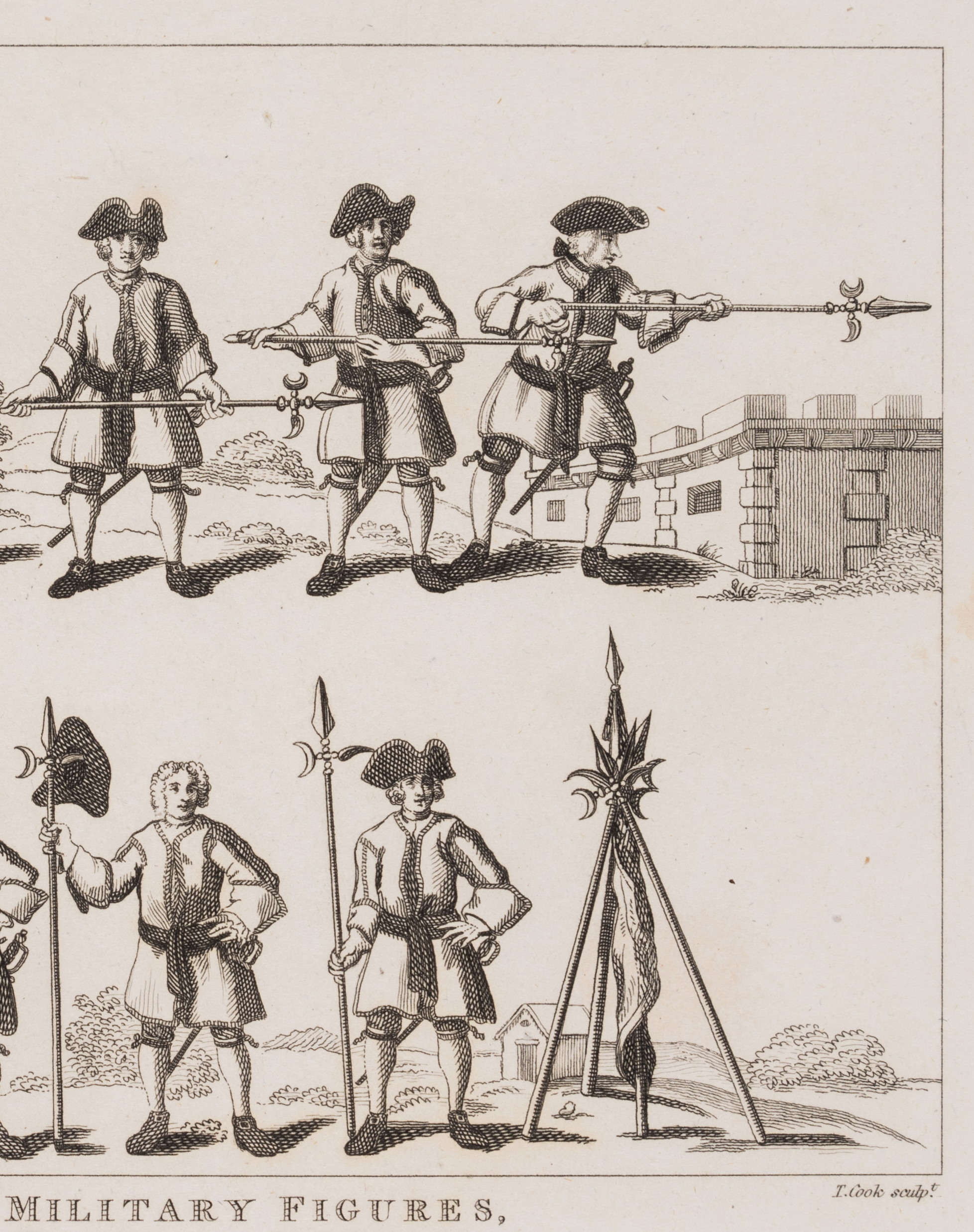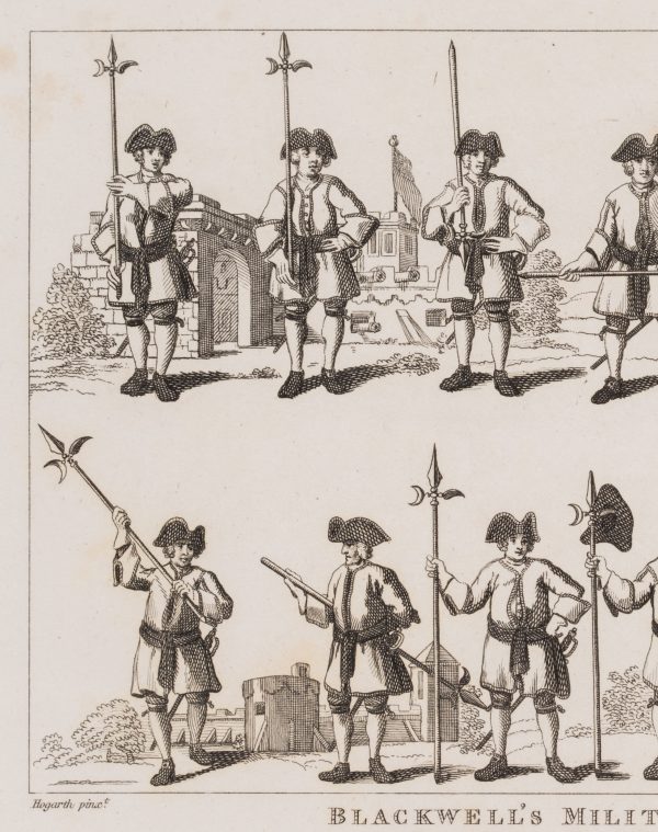 - Bezeichnung: Unten im Druck signiert: “Hogarth pinxt. | T. Cook sculpt.”. Unten im Druck bezeichnet: “Blackwell’s Military Figures. Plate II. Halberd Men.”.