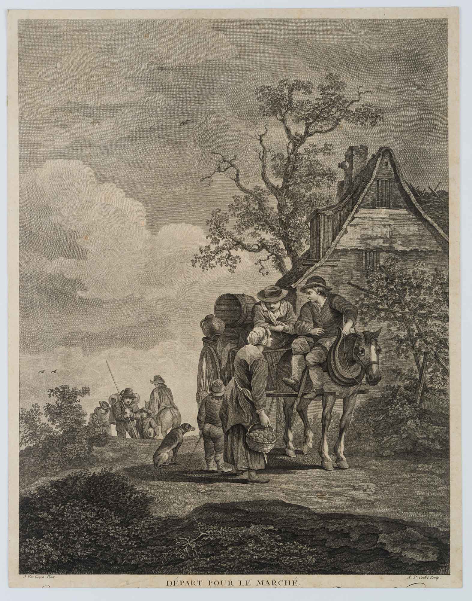 - Description: Signed J. Van Goyen Pinx. / A. P. Coulet sculp.” below the depiction, titled “Départ pour le marché” in the centre below. Round stamp on the reverse: “Kupferstichsammlung Wien-Marburg V. S.” | Watermark: House