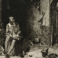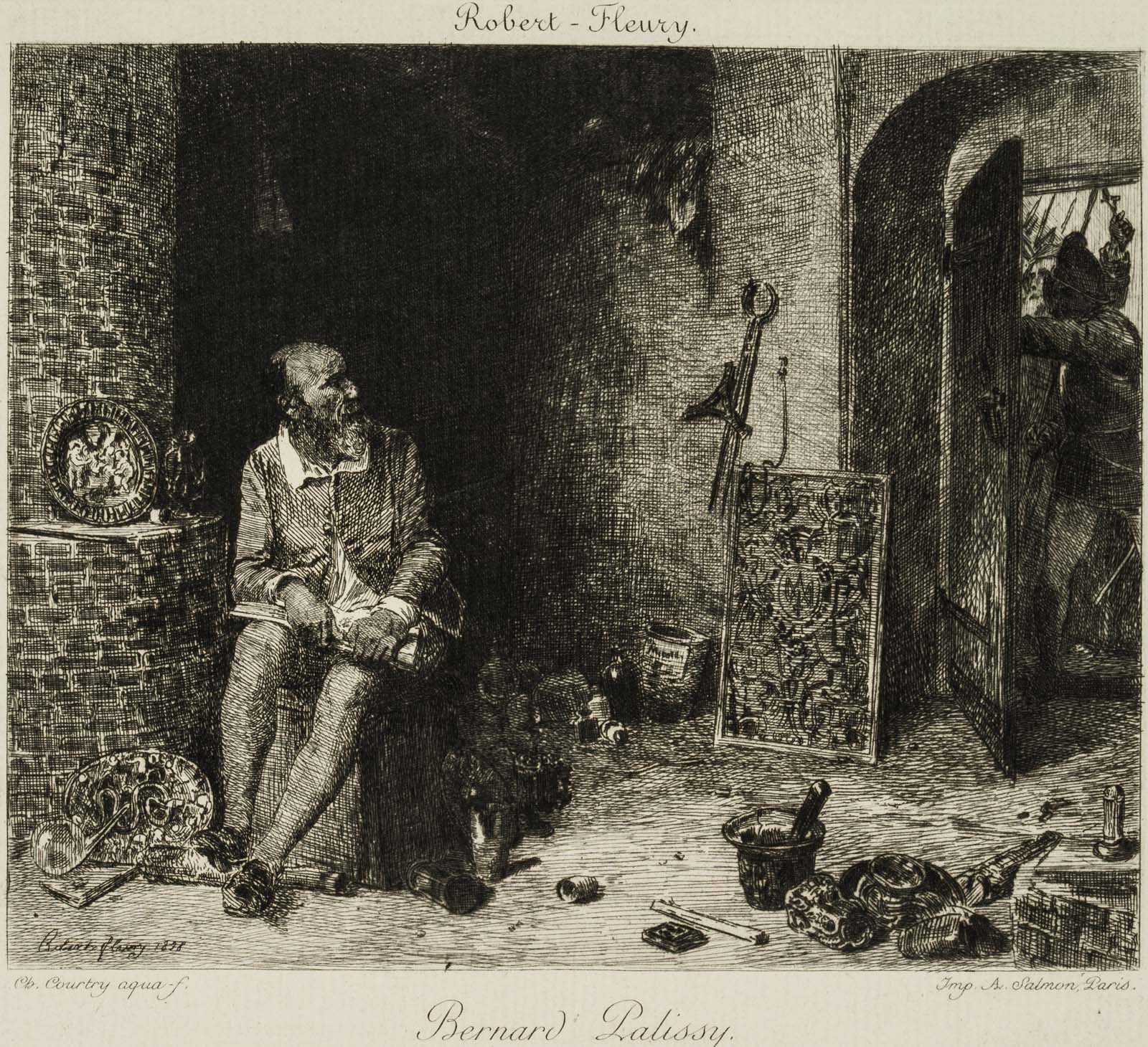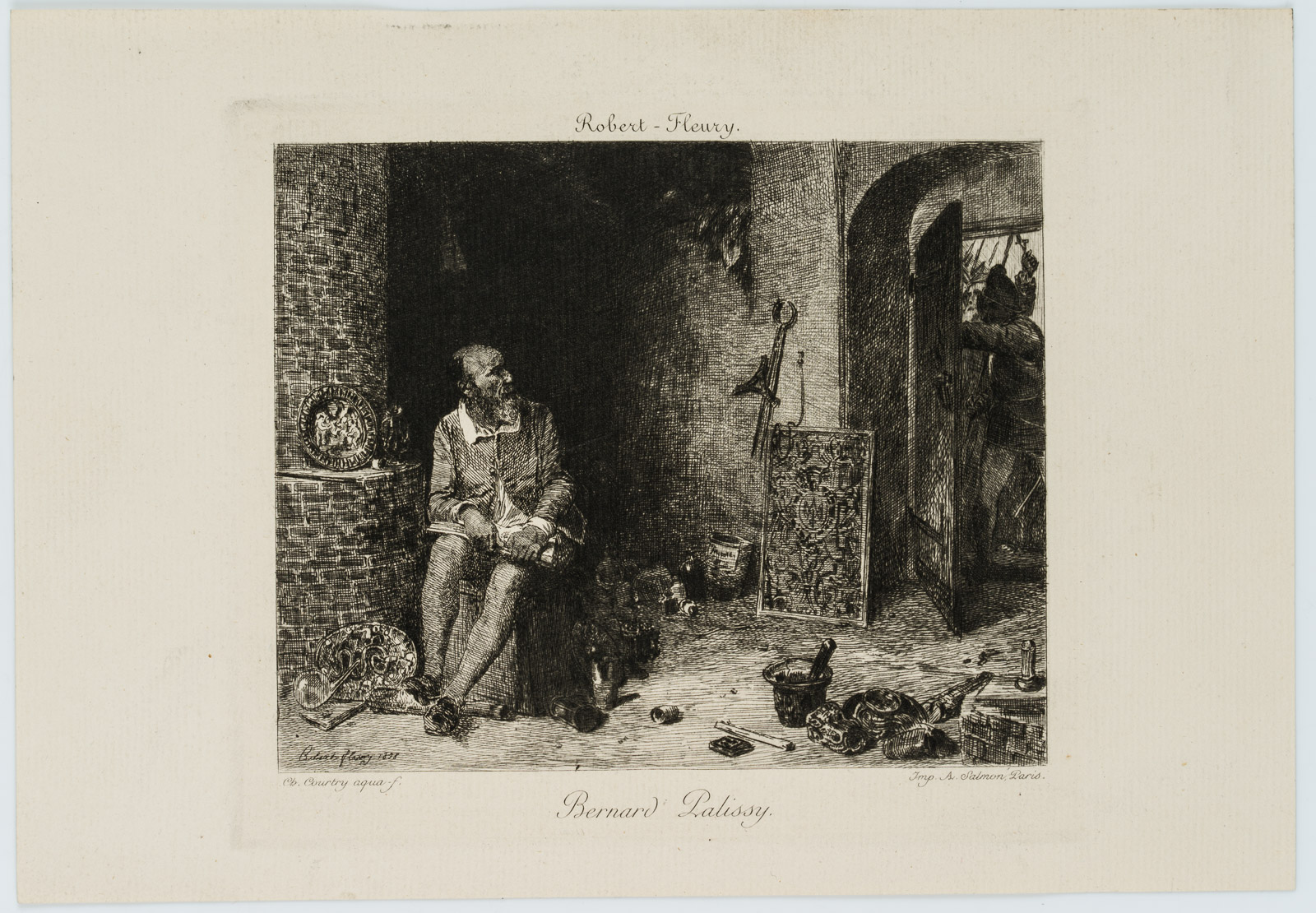 - Description: Titled and inscribed under the picture: “Ch. Courtry aqua f. / Imp. A. Salmon, Paris”. Titled above the image: “Robert-Fleury”. Verso in pencil: “4.3.81”. Portrait of a 16th century artist: Bernard Palissy (1510 in Lacapelle-Biron – 1590 in the Bastille of Paris). The famous enamel artist is co-founder of the Protestant community of Saitnes.