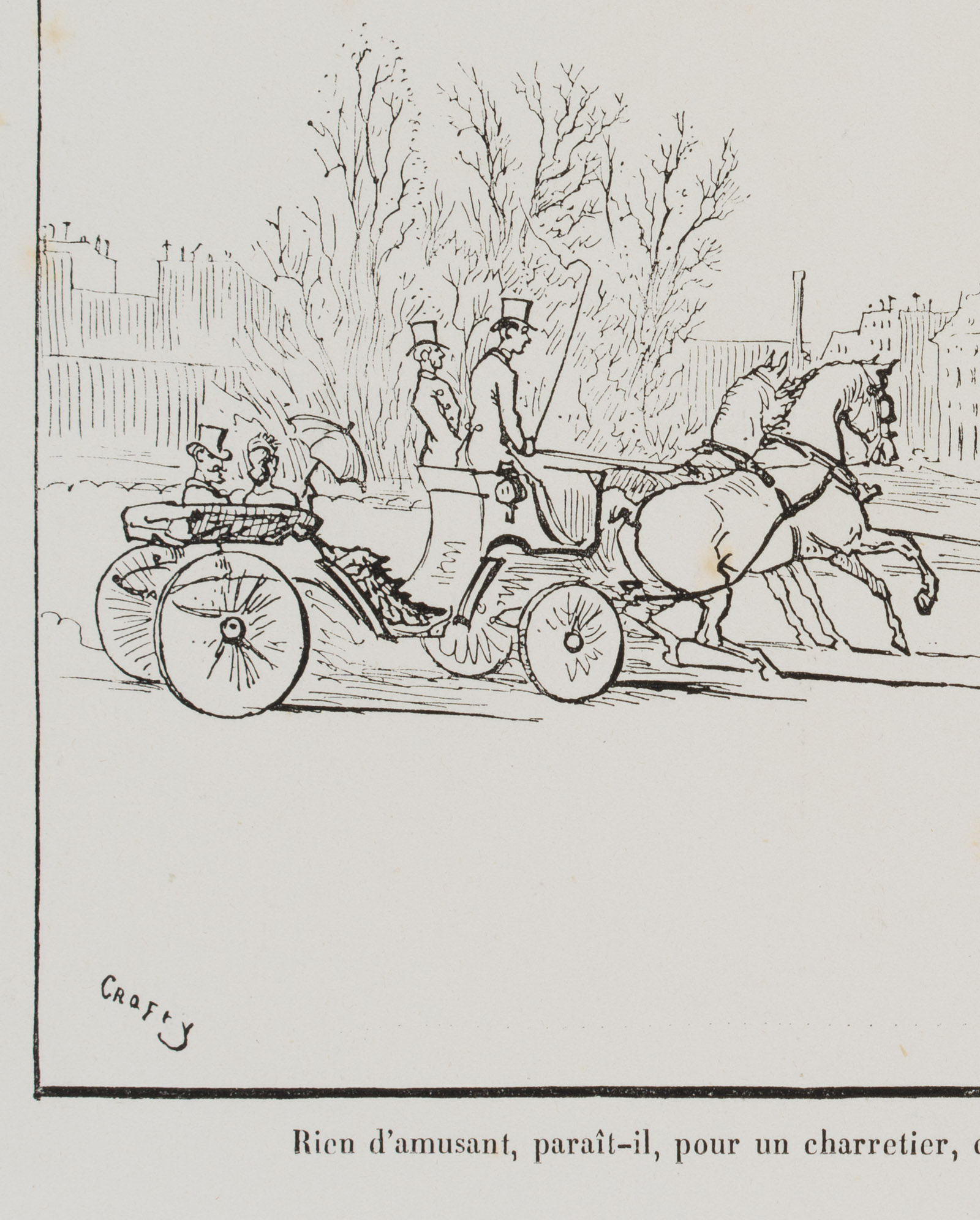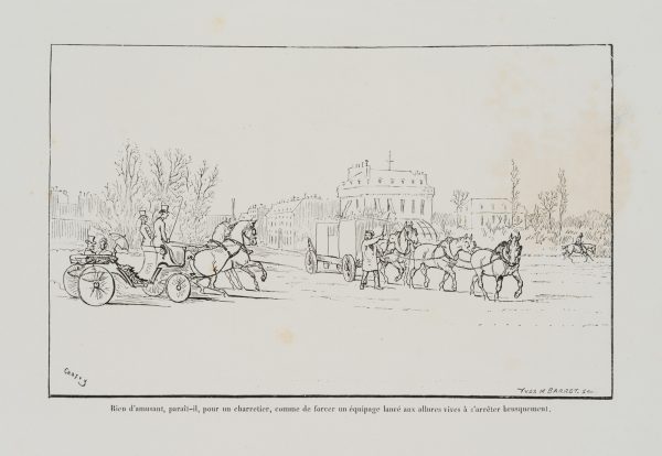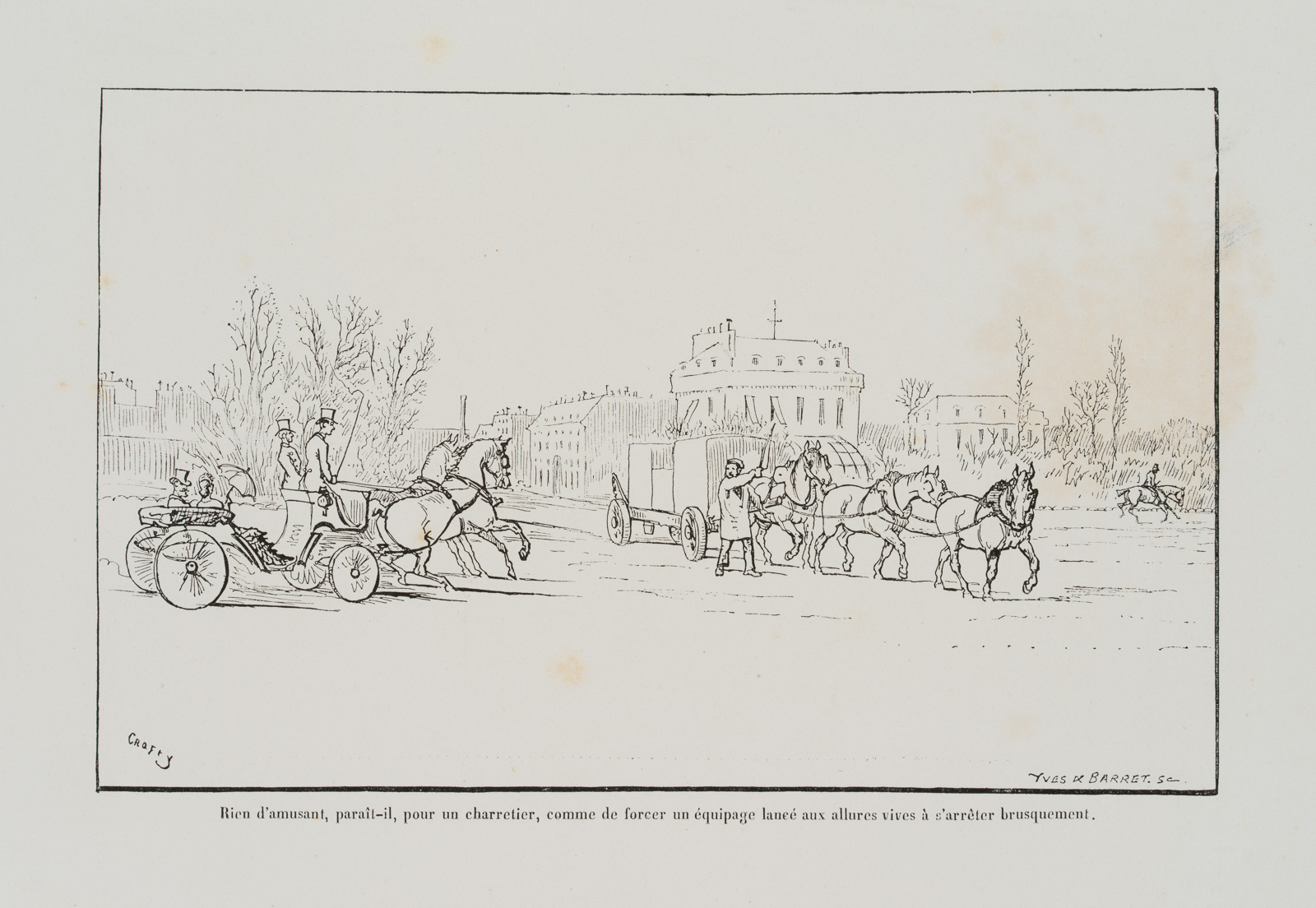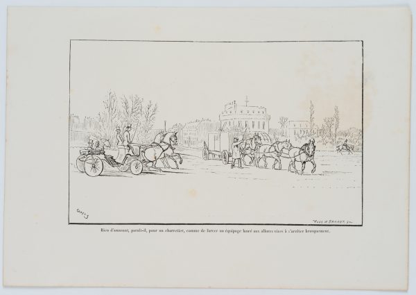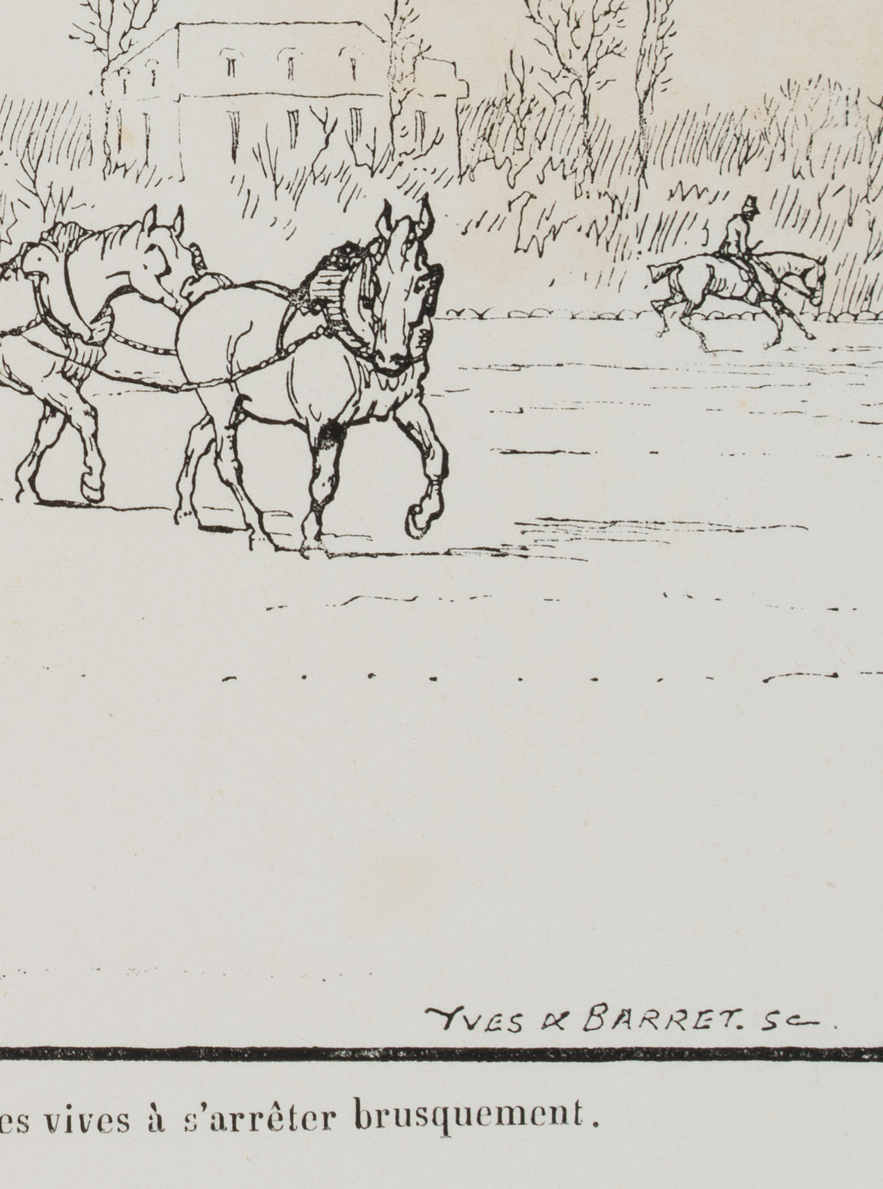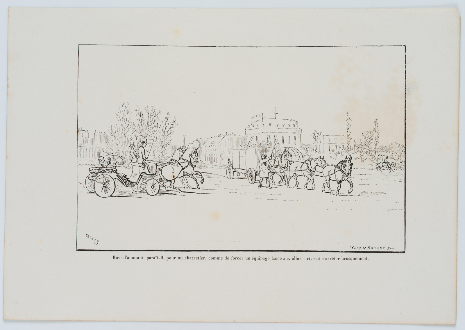 - Bezeichnung: Unten in der Darstellung signiert: “Crafty / Yves Barret sc.”. Darunter bezeichnet: “Rien d’amusant, para?t-il, pour un charretier, comme de forcer un équipage lancée aux allures vives à s’arrêter brusquement.”