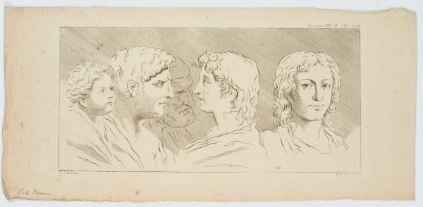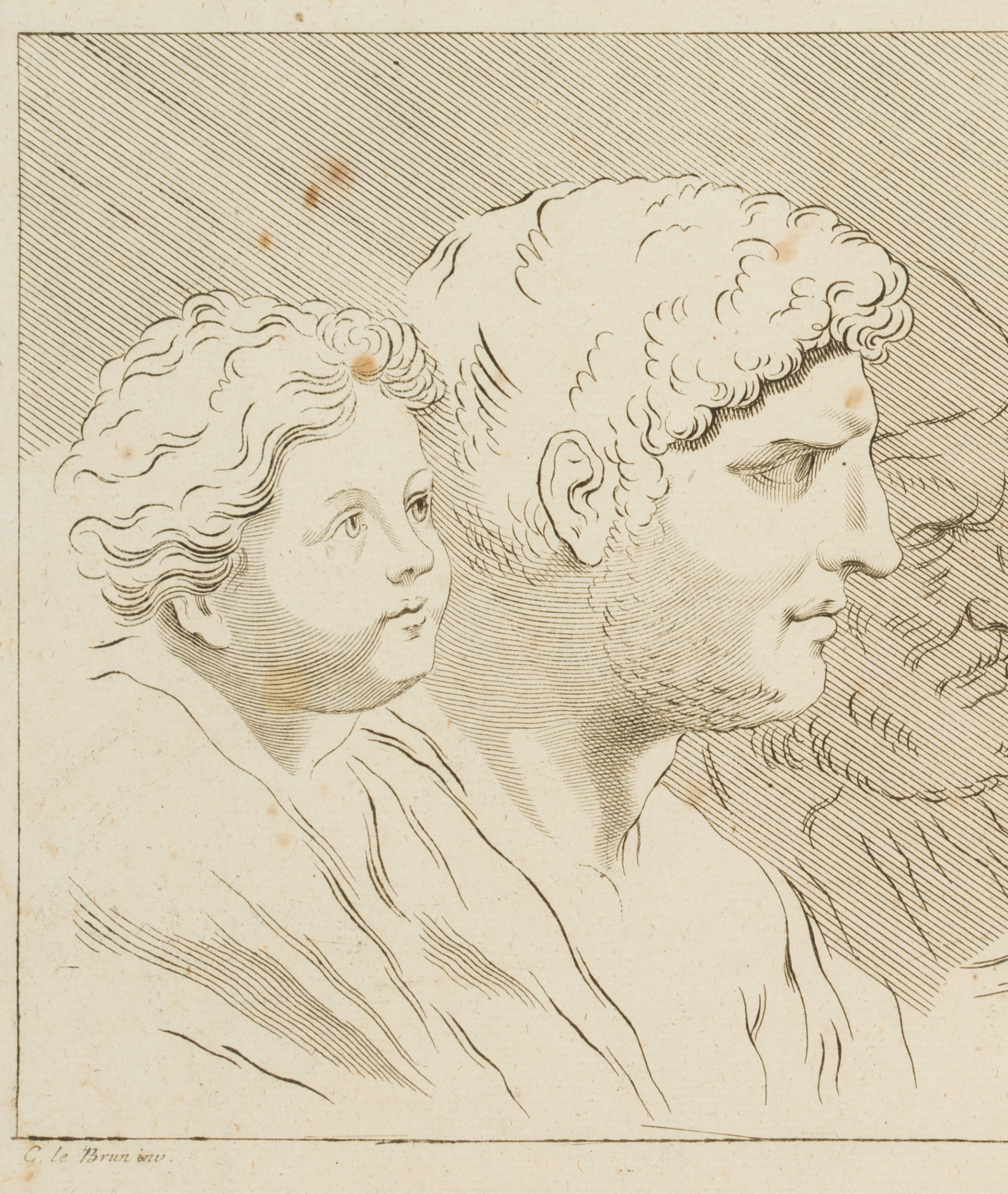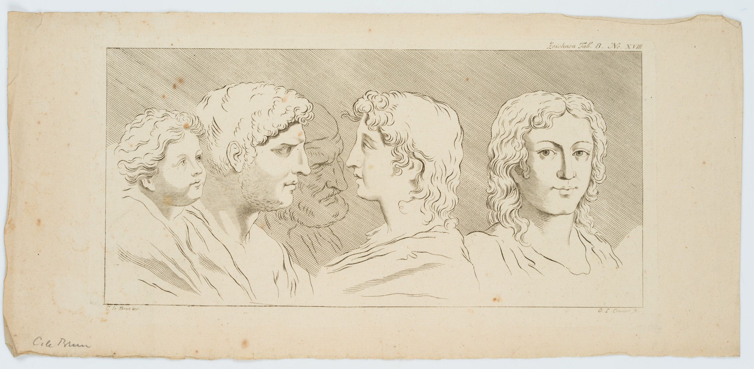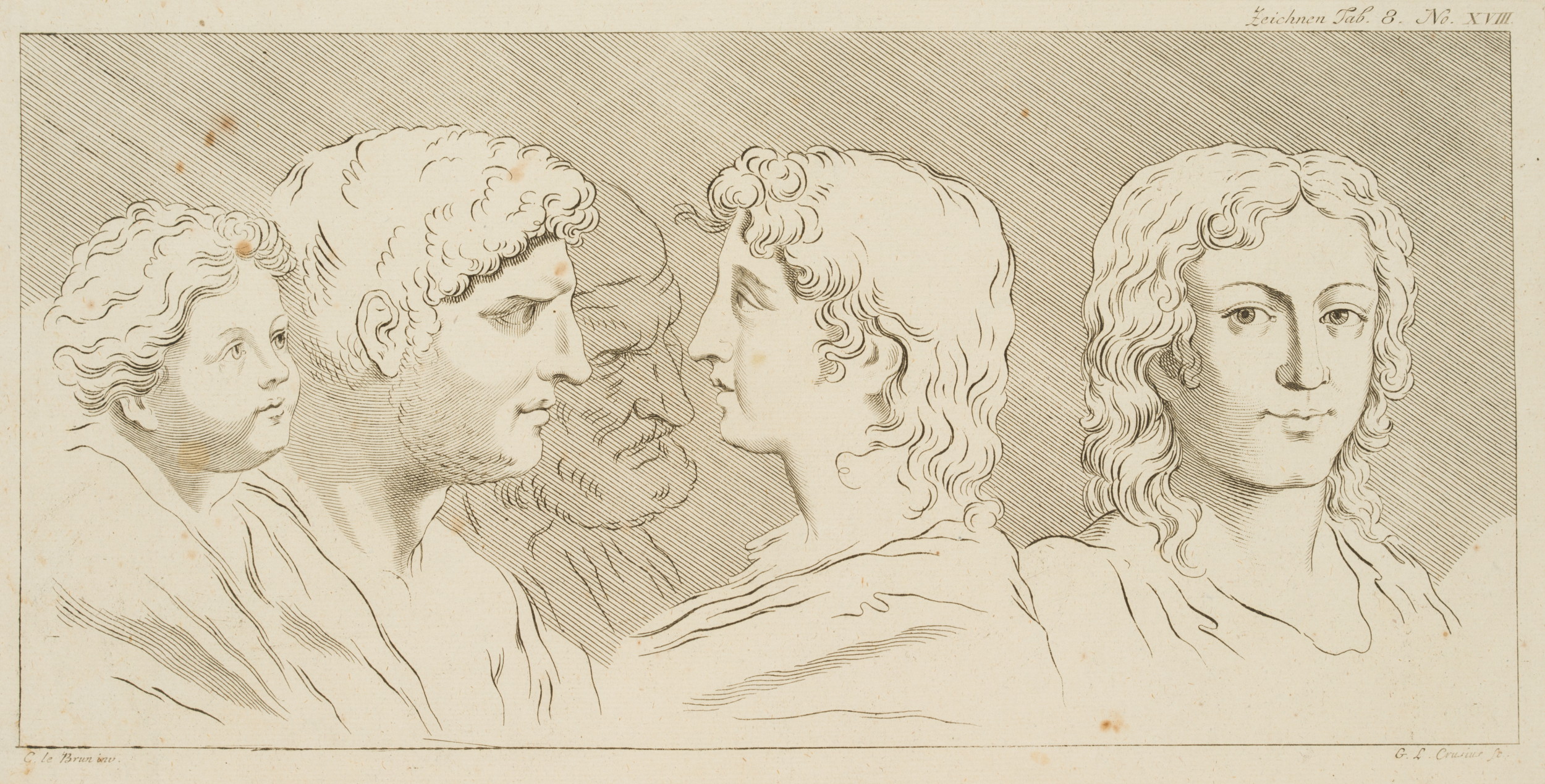 Gottlieb Leberecht Crusius (1730 Steinpleis bei Werdau – 1804 Leipzig) nach Charles le Brun (1619 Paris – 1690 ebd.), Zeichenübungen, Porträt- und Kopfstudien, um 1762, Kupferstich