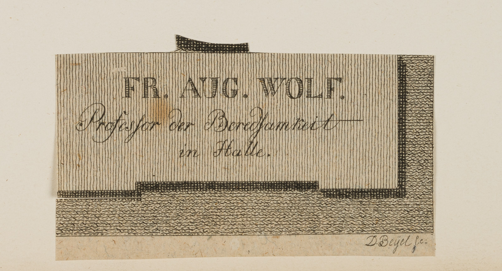 - Beschreibung: Frontispiz zu: Allgemeine deutsche Bibliothek. 112.Band, erstes Stück, 1792, bei: Carl Ernst BohnVerso mit aufgezogener Beschriftung: FR. AUG. Wolf. / Professor der Beredsamkeit / in Halle. Inschrift unten rechts: D. Beyel sc.
