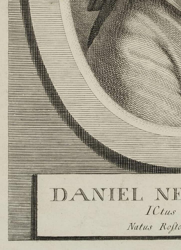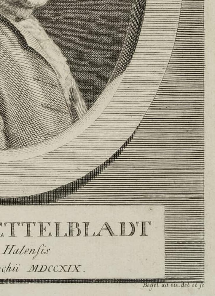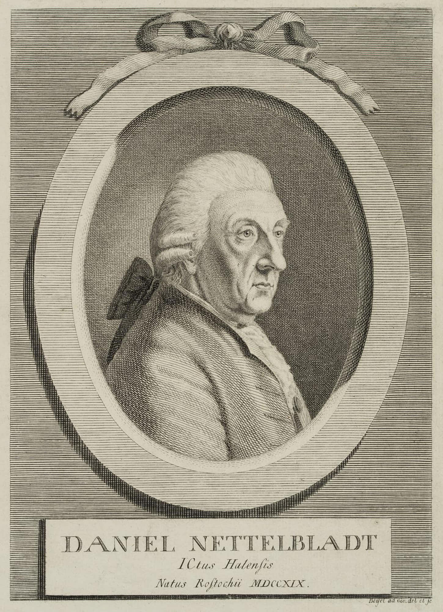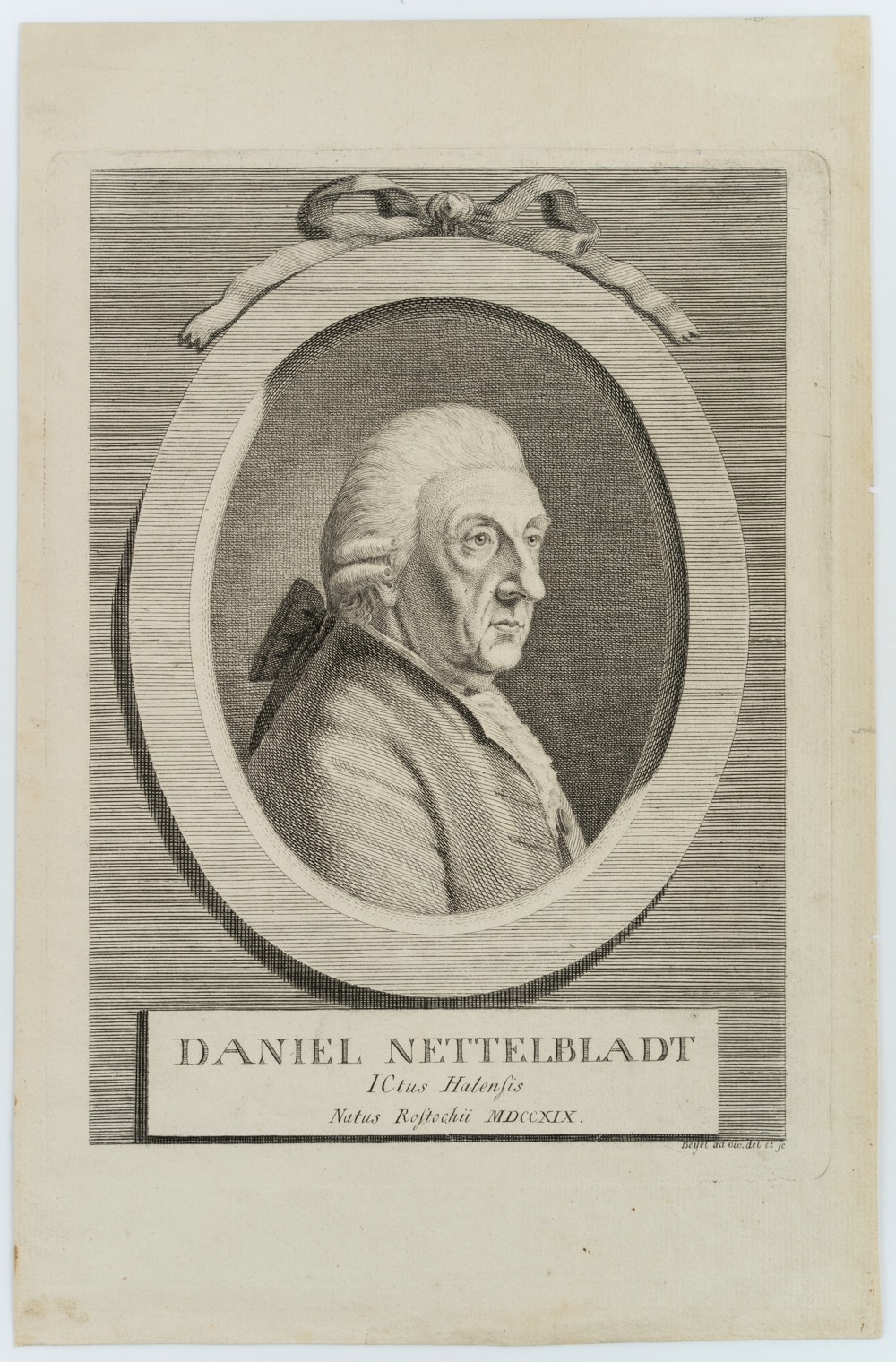 - Beschreibung: Brustbild im Halbprofil. Zeigt einen der bedeutendsten Rechtsgelehrten in der zweiten Hälfte des 18. Jahrhunderts. Nettelbladt war seit 1765 königlich preußischer Geheimrat und ab 1775 Primarius und Präses der juristischen Fakultät der Universität Halle.