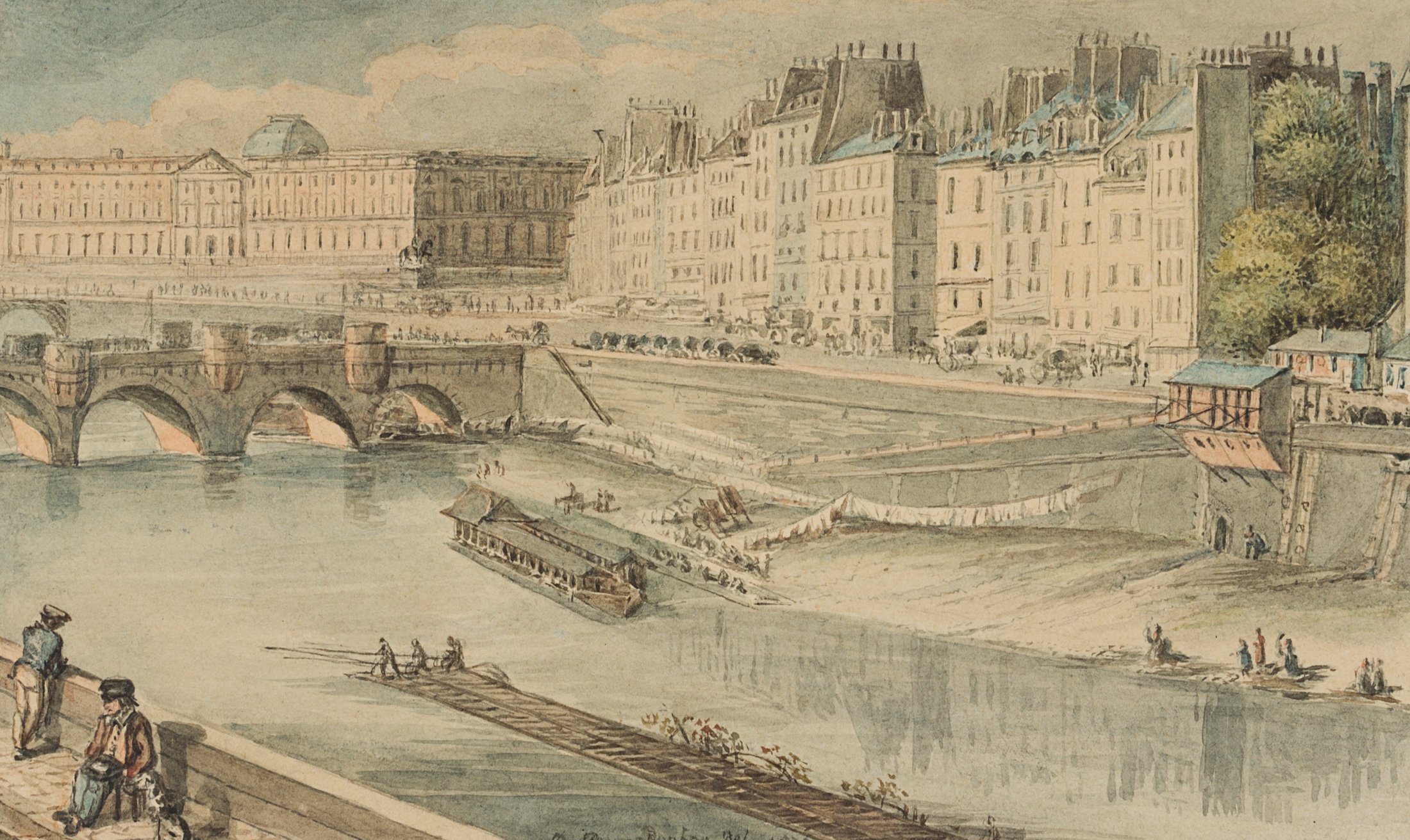 - Description: Charming view of the Pont Neuf by the Swiss painter Daniel Burgdorfer, who specialised in portraits and vedute after his apprenticeship in Bern with the miniaturist Pierre-Louis Bouvier (1765-1836). Particularly the detail in the depiction of the architecture and urban life along the river testify to Burgdorfer’s special artistry.