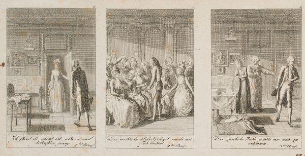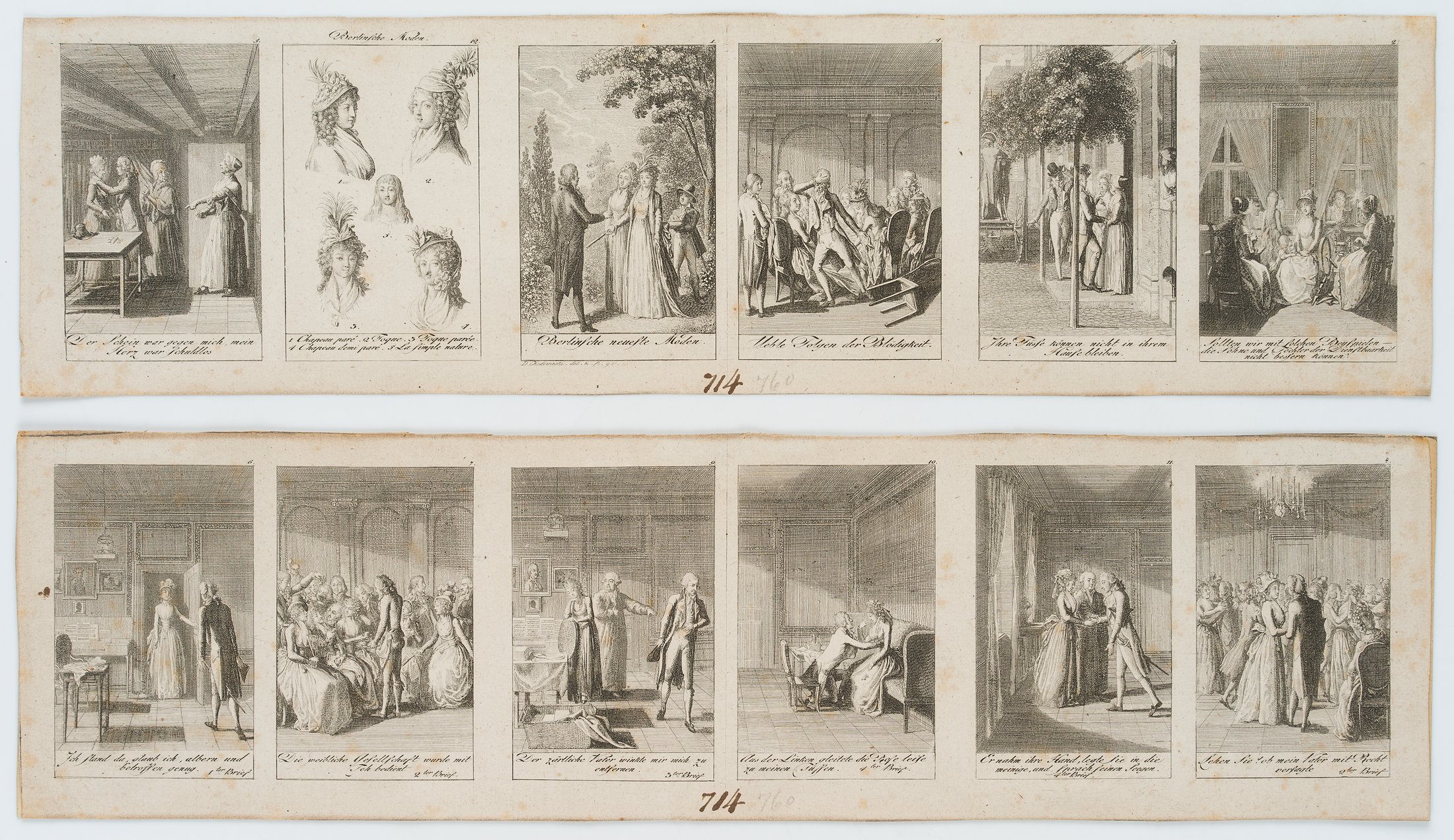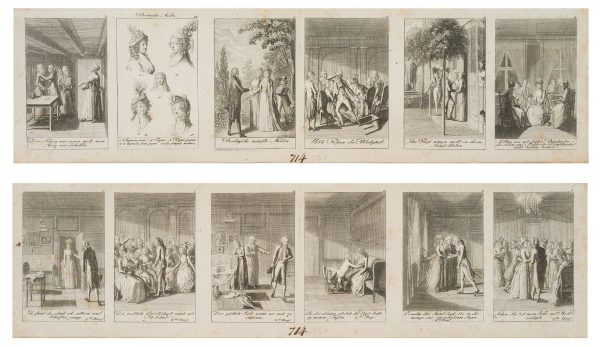 - Inscription: 1st sheet signed lower left in the printing plate and dated: “D Chodowiecki. del. & sc. 95.”, inscribed in pen at lower centre: “714”, next to it in pencil:'”760″.