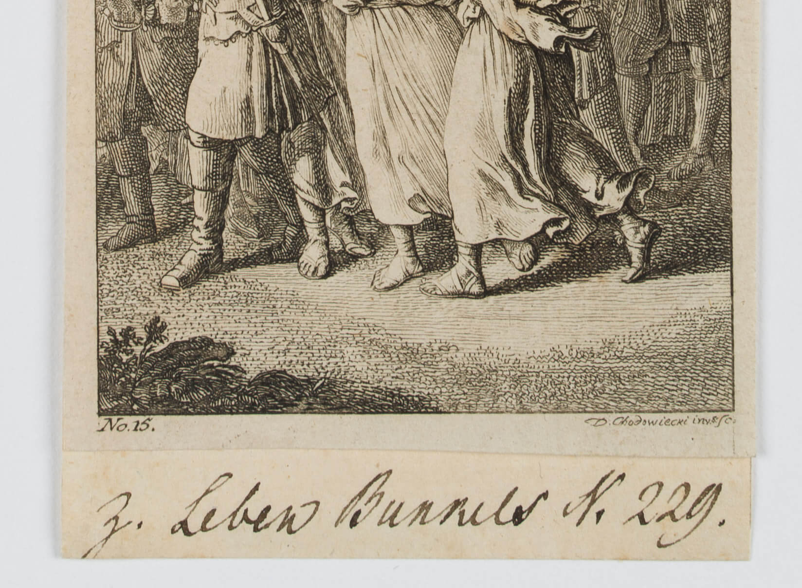- Bezeichnung: Links unter der Graphik nummeriert mit “No 15”, daneben signiert. Rechts oben a, Blattrand nummeriert mit “IV.Th”. Auf dem Blattträger von fremder Hand beschrieben mit “z. Leben Bunkels N. 229”.