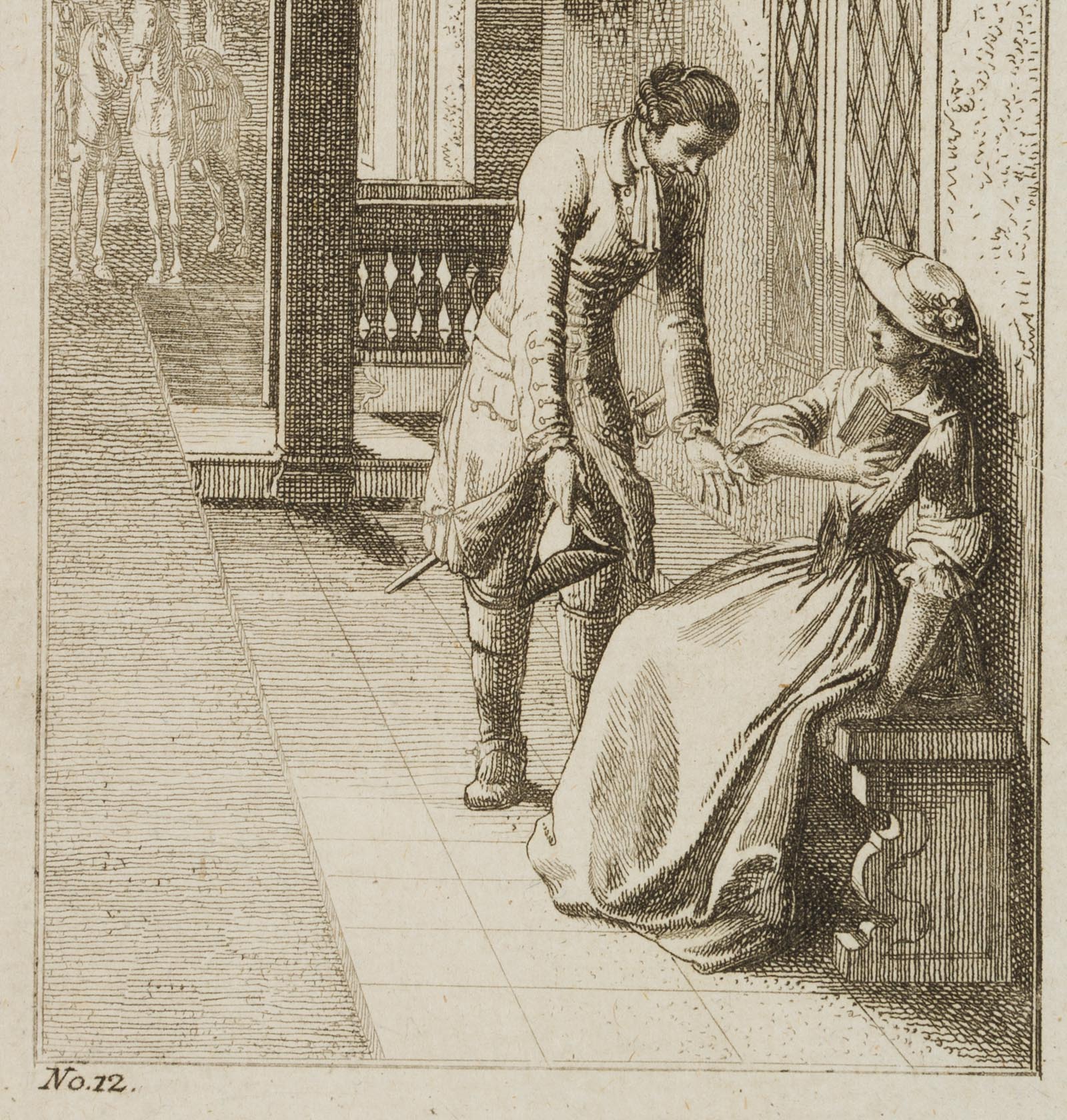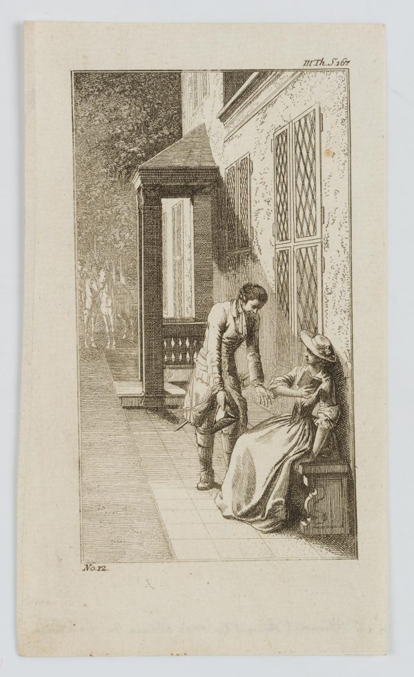 - Bezeichnung: Unterhalb der Darstellung nummeriert mit “No.12”. Rückseitig handschriftlich beschriftet mit “Bunkel findet Miss Carola Bennet wieder”.