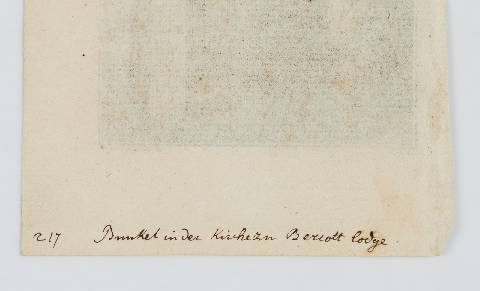 - Bezeichnung: Unterhalb der Darstellung nummeriert mit “No.3” und signiert. Rückseitig handschriftlich beschriftet mit “217 Bunkel in der Kirche zu Bercott Lodge[?]”.