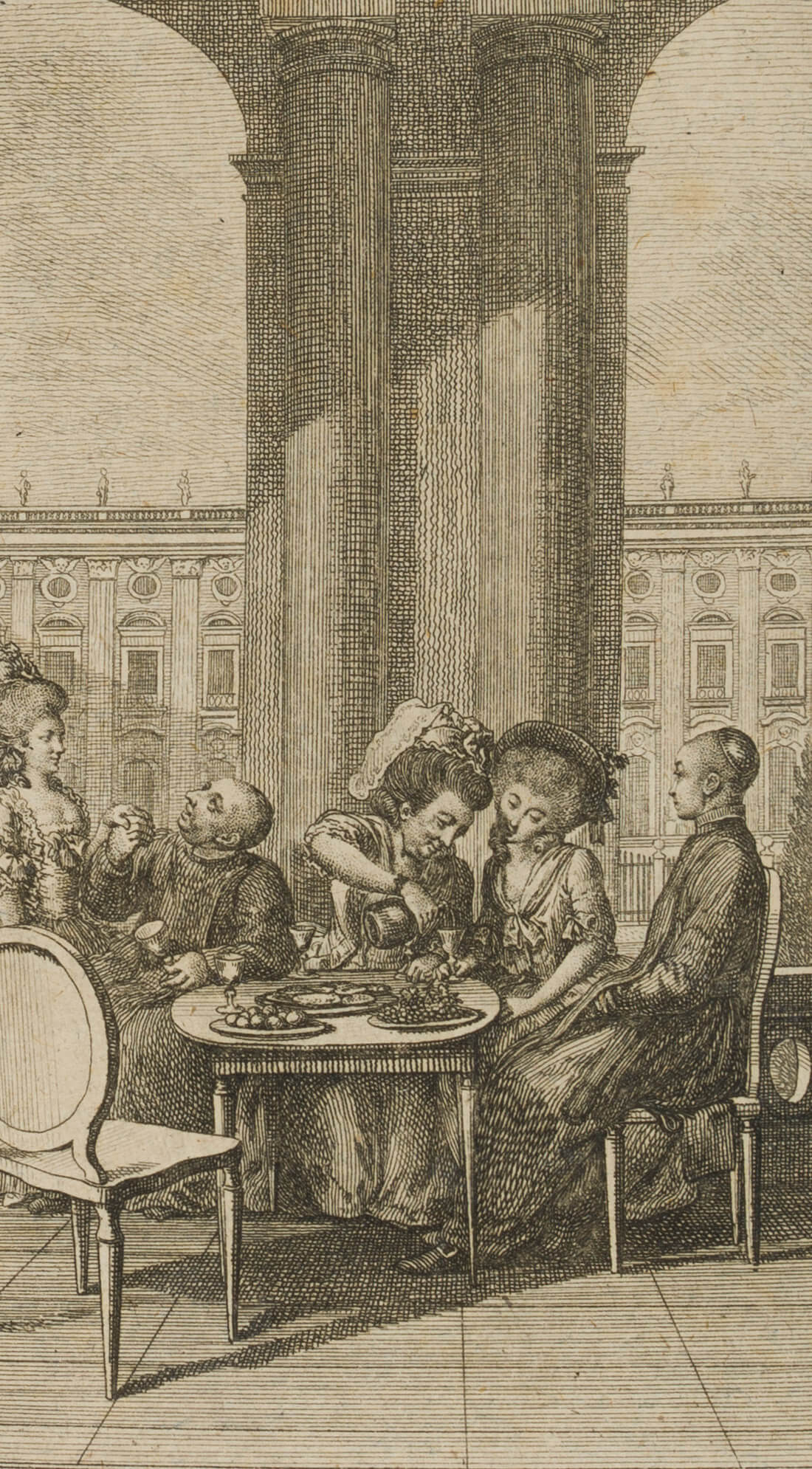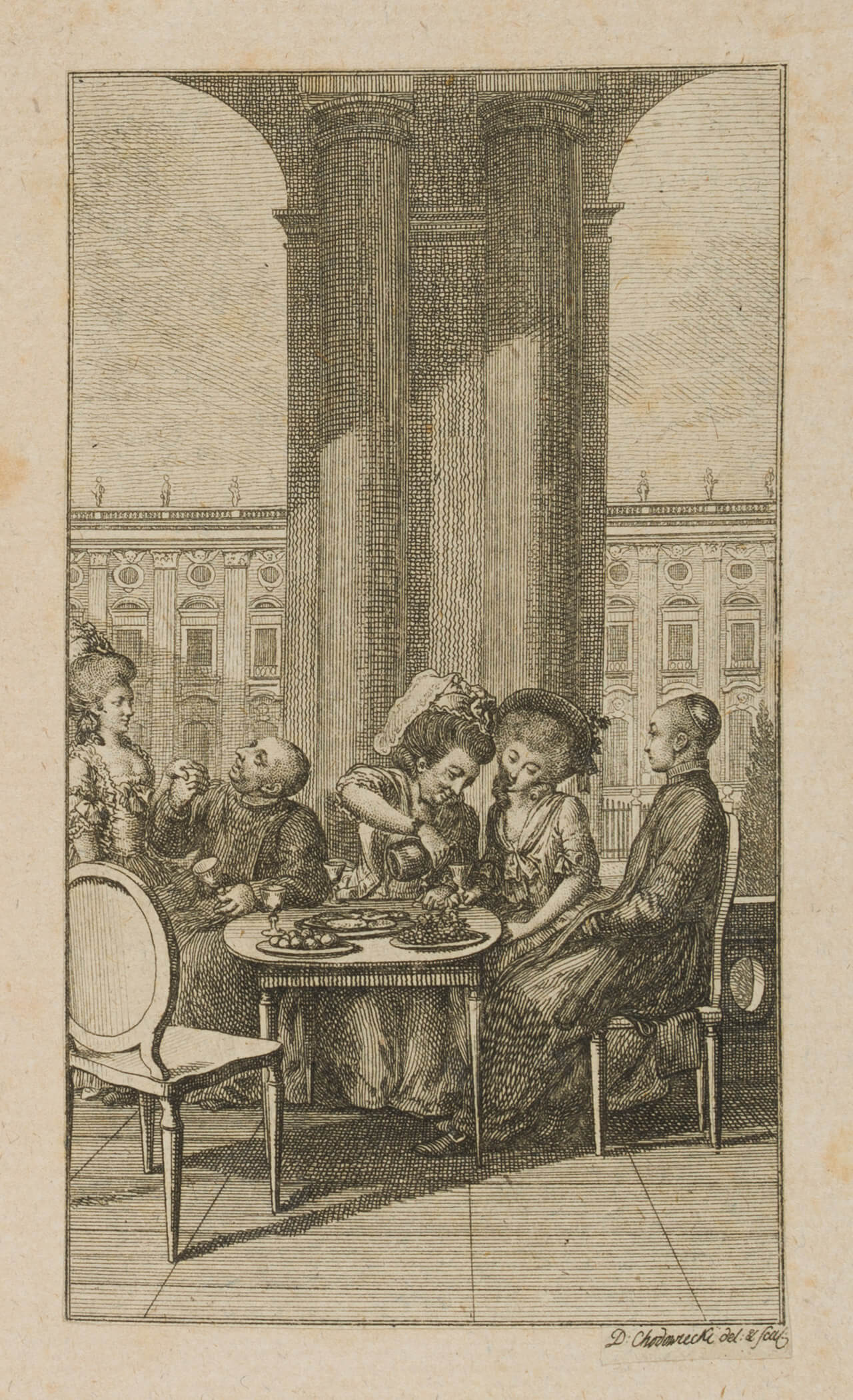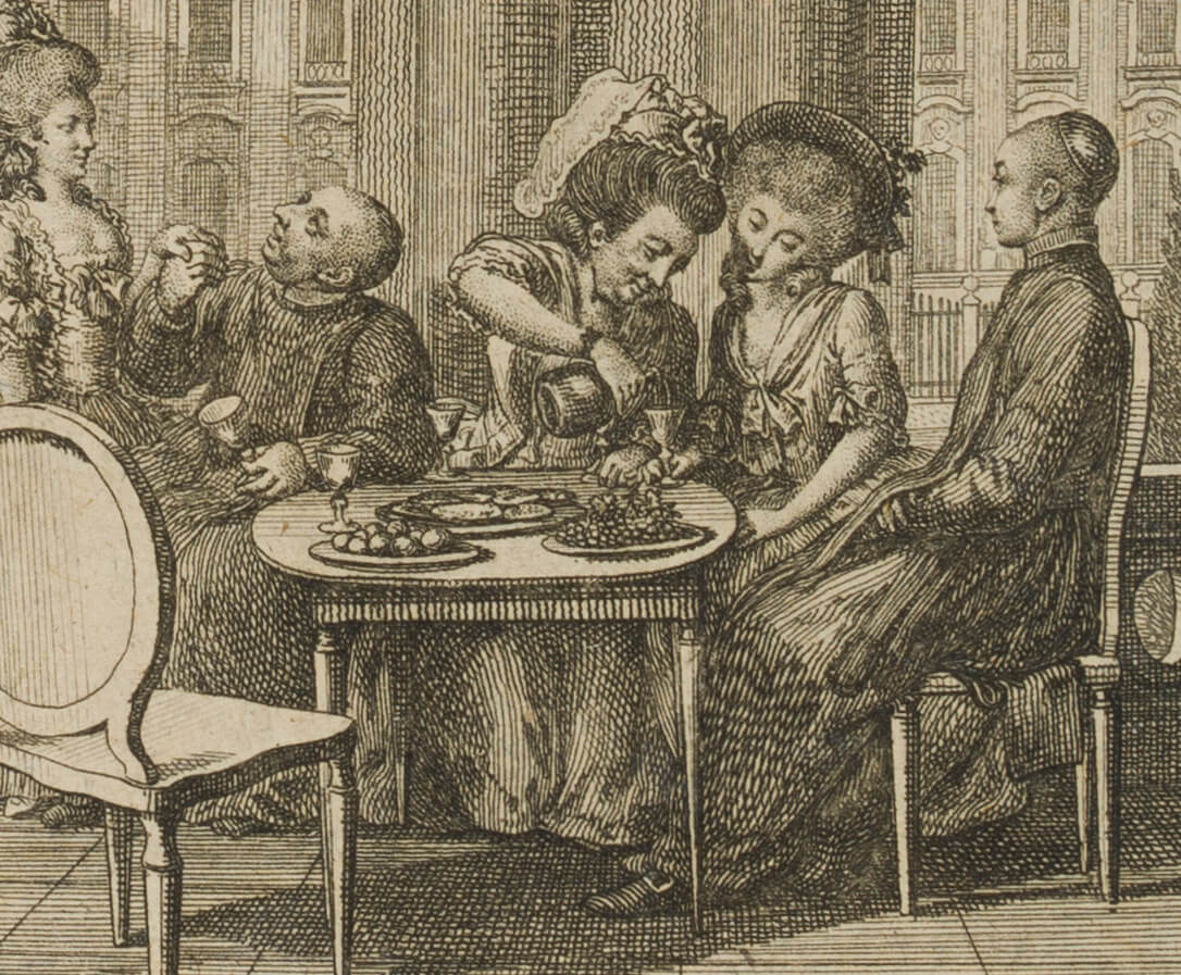 • Schlagworte: Geistliche, Ordensmänner, Pileolus, elegante Damen, Mahlzeit, Wein, Terrasse, Religiös, Literatur, Deutschland, Rokoko, 1700-1749