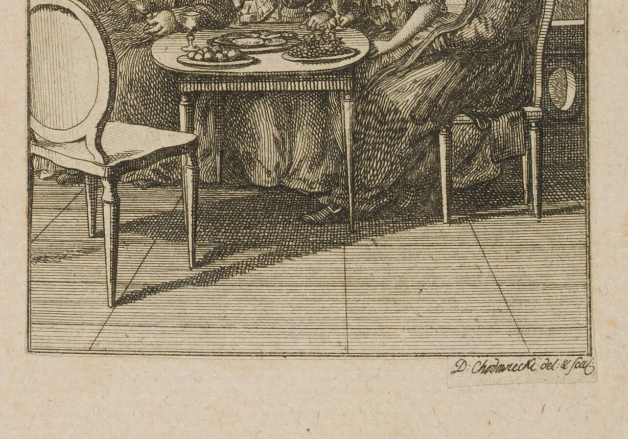 Daniel Nikolaus Chodowiecki (1726 Danzig – 1801 Berlin), Buchillustration. Damen mit Ordensmännern auf der Terrasse speisend, 18. Jahrhundert, Kupferstich