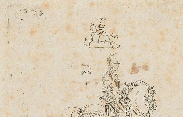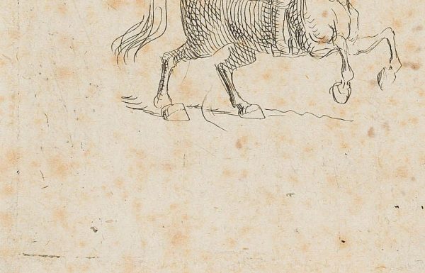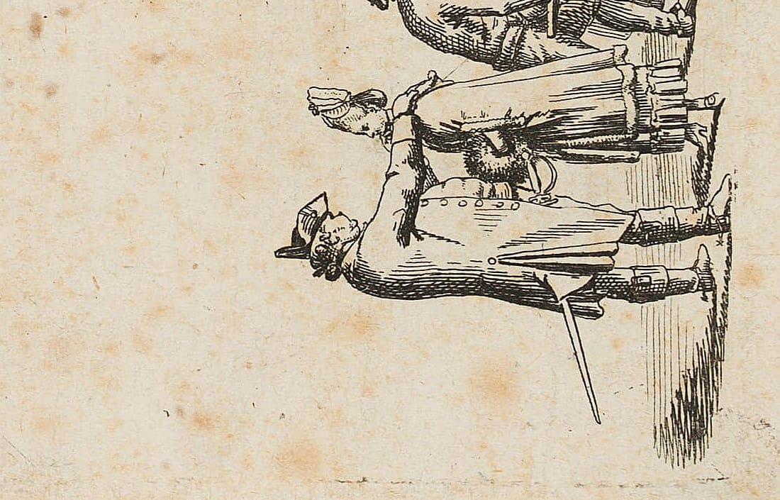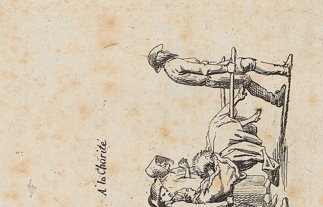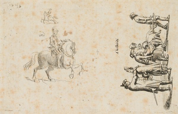 - Description: “A la Charité’ is written at the bottom above a group where two men are carrying a woman’s room on a stretcher to the right, next to which an old woman is walking. On the left, a fat officer stands next to a young girl with a muff, on whose shoulder he has placed his right hand, with the other he grasps her chin. In the upper space of the plate across is an armoured horseman galloping to the right; next to him a small horse’s head in contour, and above both a small horseman sprinting to the left, slightly wheeled in.” (Engelmann 1857, p. 61).