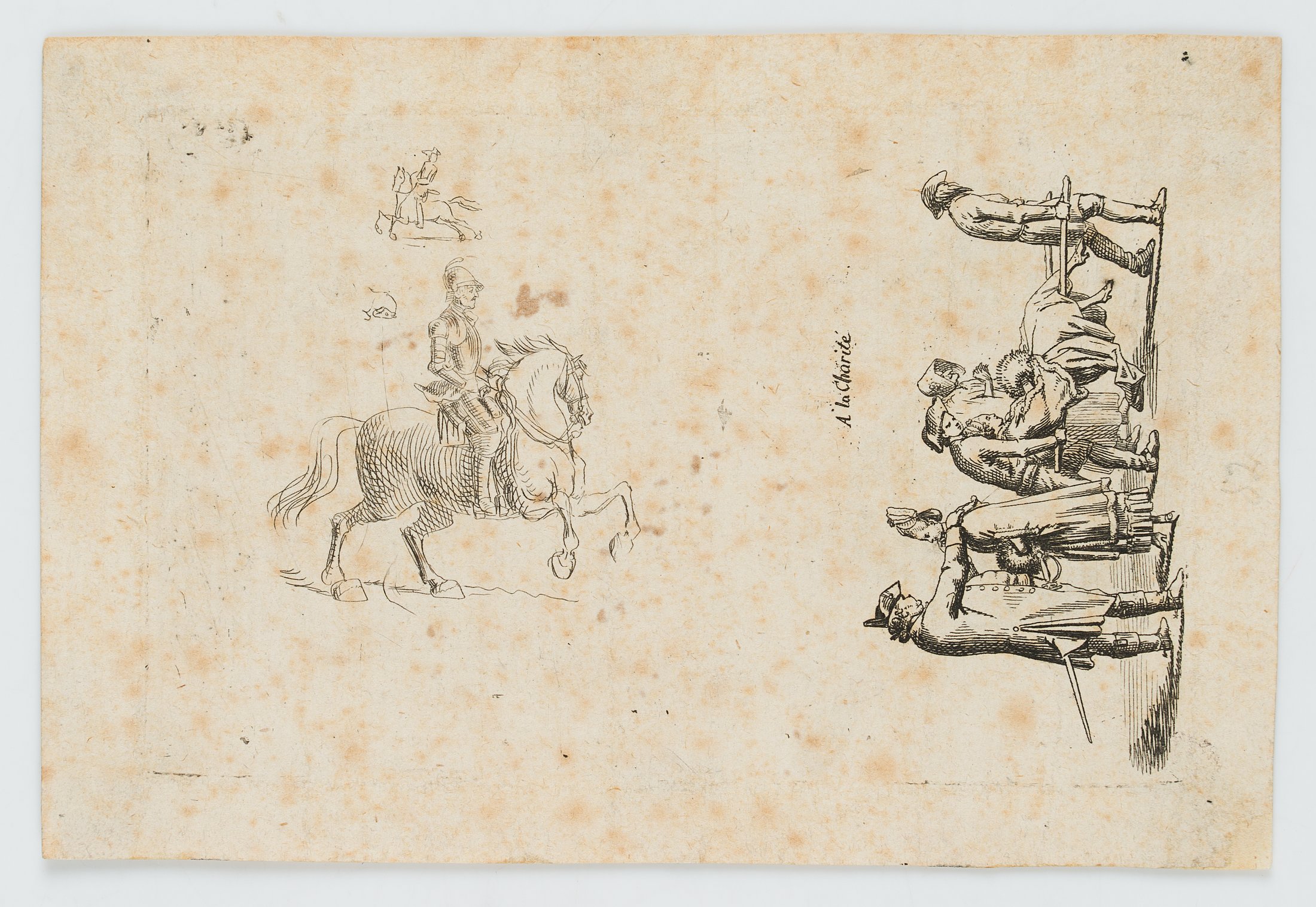 - Beschreibung: “‘A la Charité’ steht unten über einer Gruppe, wo zwei Männer ein Frauenzimmer auf einer Bahre nach Rechts tragen, neben welcher eine alte Frau geht. Links steht ein dicker Offizier neben einem jungen Mädchen mit Muff, auf deren Schulter er seine rechte Hand gelegt hat, mit der andern fasst er sie am Kinne. In dem oberen Raume der Platte quer ist ein nach Rechts galoppirender geharnischter Reiter; daneben ein kleiner Pferdekopf in Contur, und über beiden ein kleiner Reiter, der nach Links sprengt, leicht einradirt.” (Engelmann 1857, S. 61).