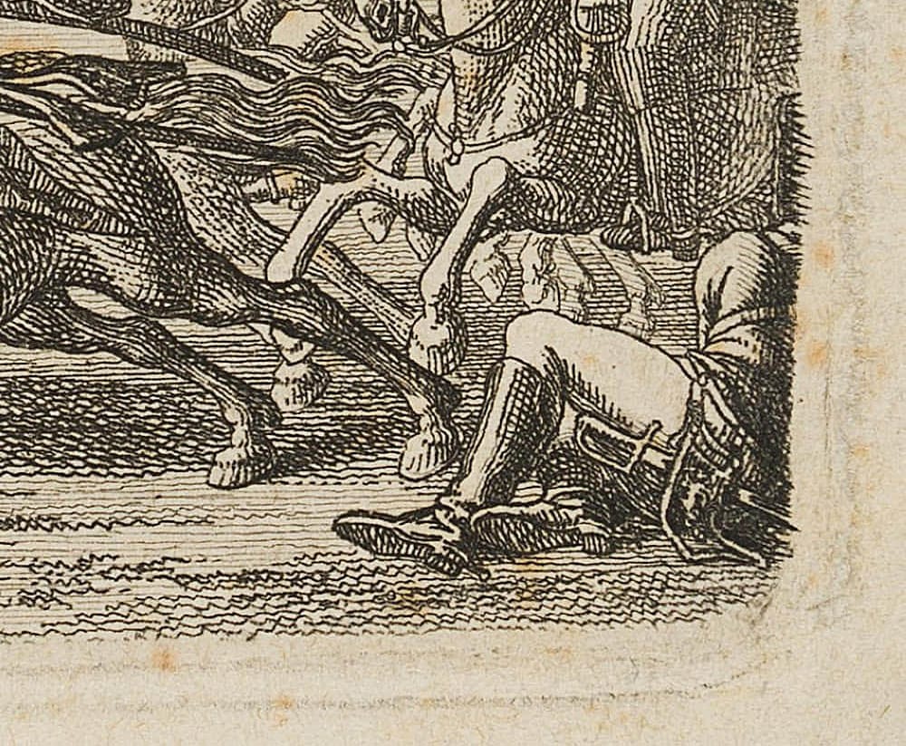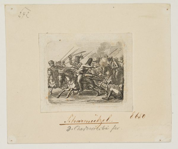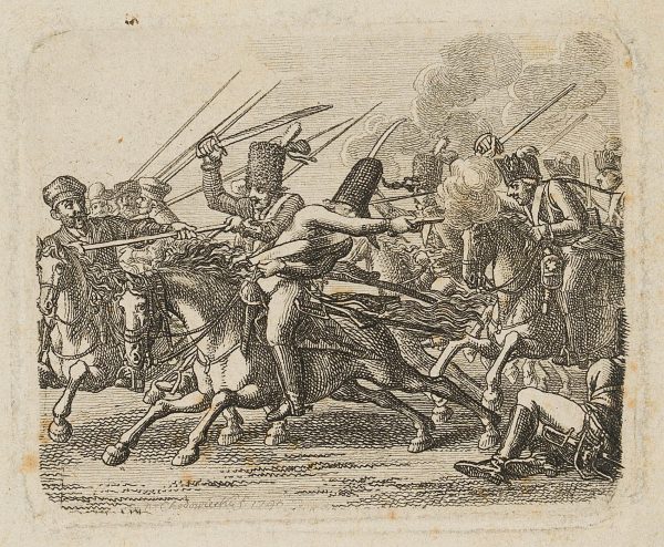 - Description: “Cossacks, hussars and cuirassiers in battle blasting to the left. On the right on the ground lies a Blessirter.” (Engelmann 1857, p. 347).