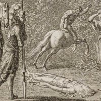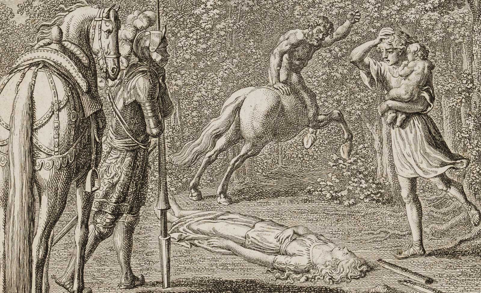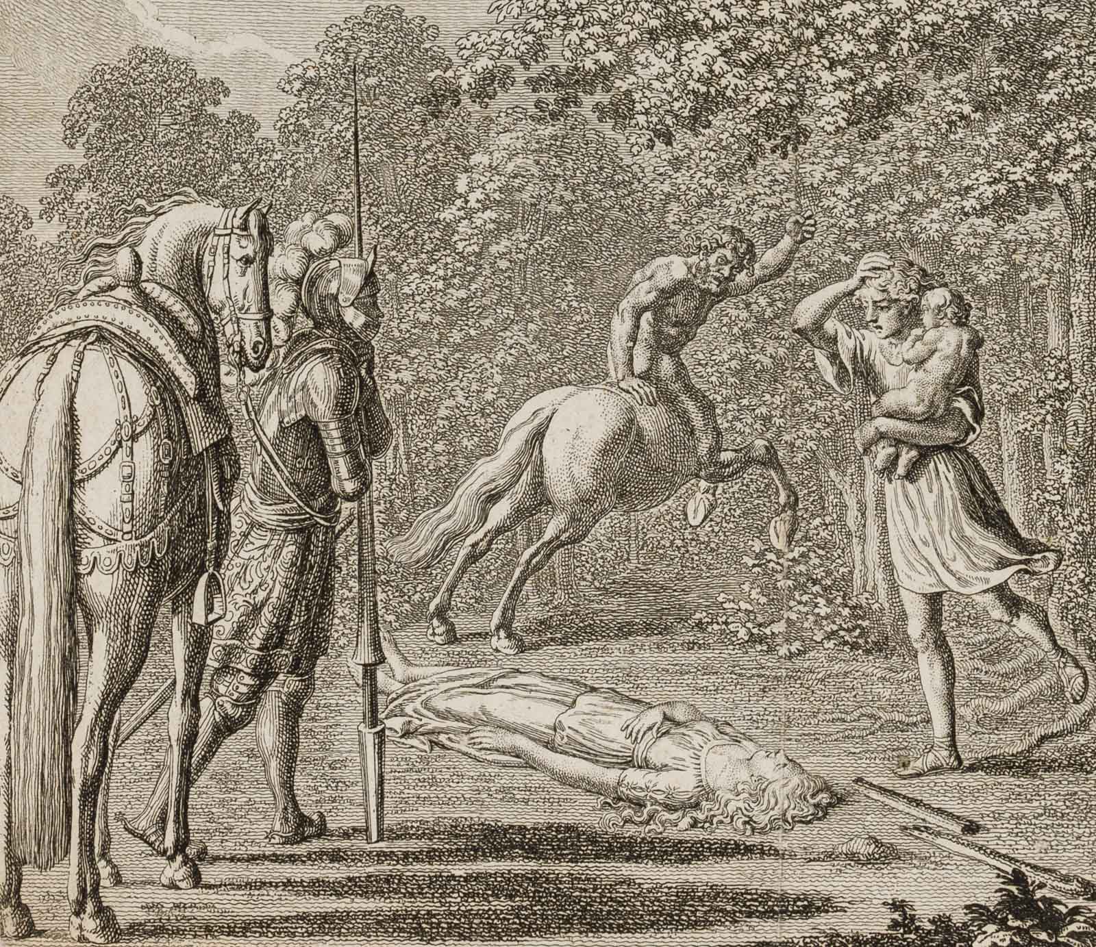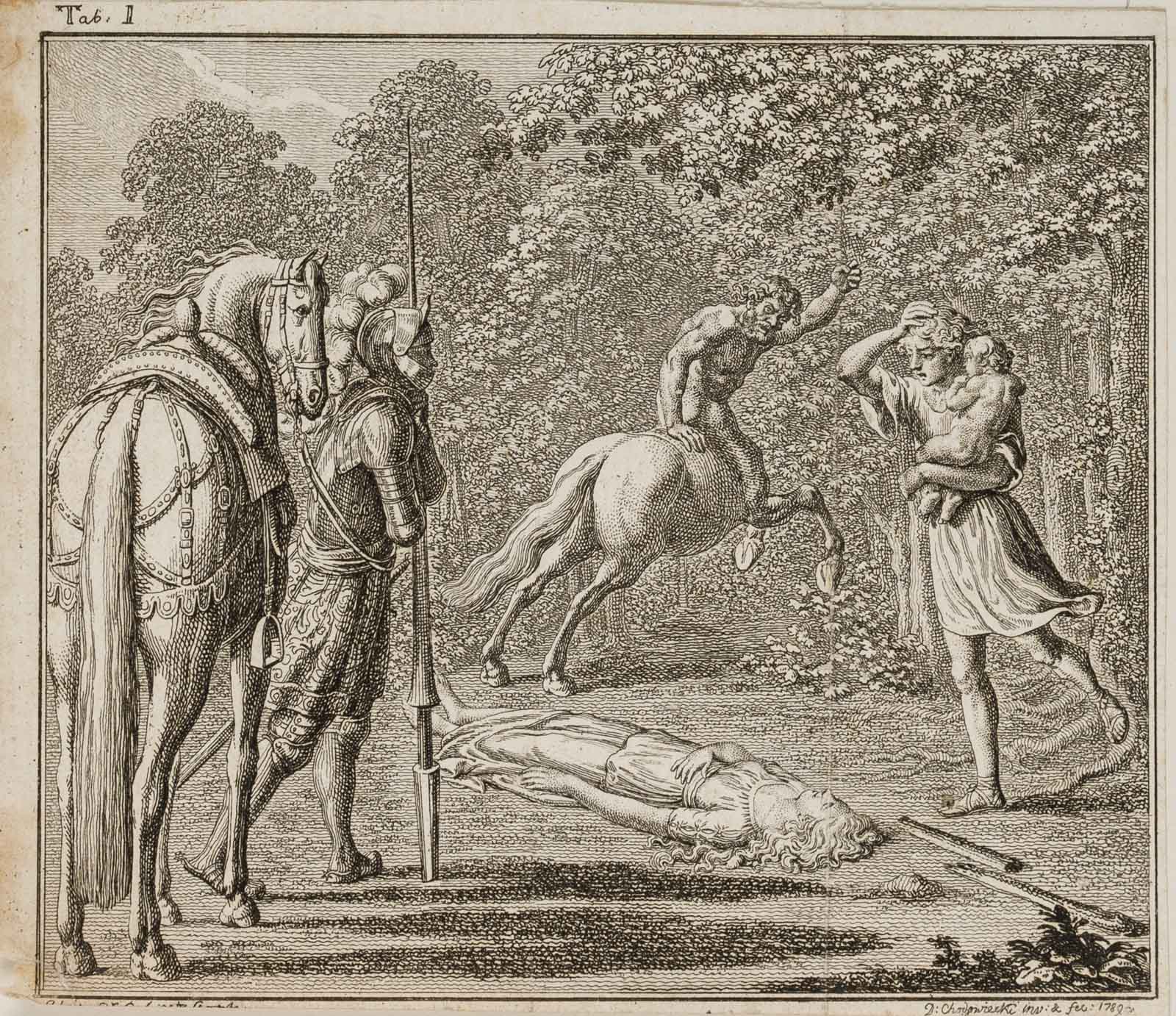 Daniel Nikolaus Chodowiecki (1726 Danzig – 1801 Berlin), Idris und Zenide. Mit Idris im Harnisch, die den bösartigen Zentauren vertreibt, Blatt zu Wielands Idris, 1789, Radierung