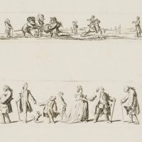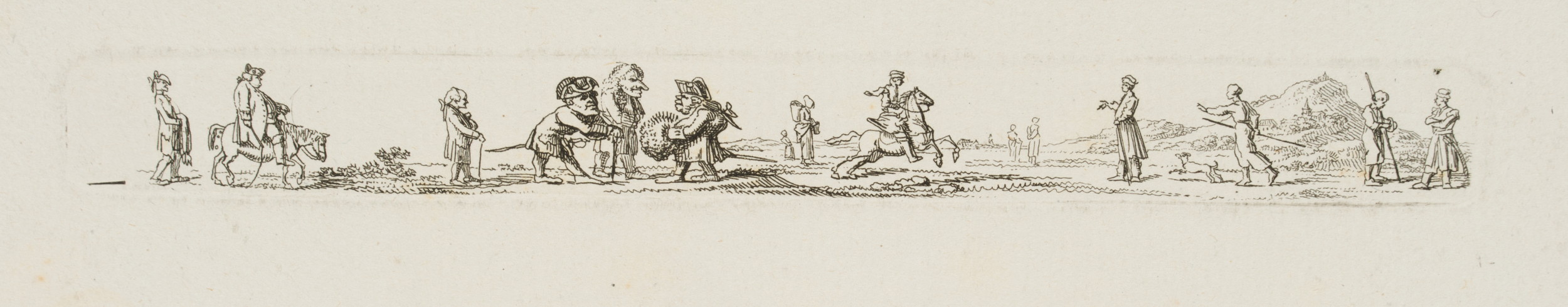 - Beschreibung: Zwei Platten auf einem Papierbogen gedruckt. Oben “Carricaturen I” (Engelmann 136), unten “Carricaturen II” (Engelmann 137). Zeigt einige Figuren mit karikierenden Zügen. Im unteren Druck laut Engelmann satirische Darstellungen damals bekannter Persönlichkeiten.
