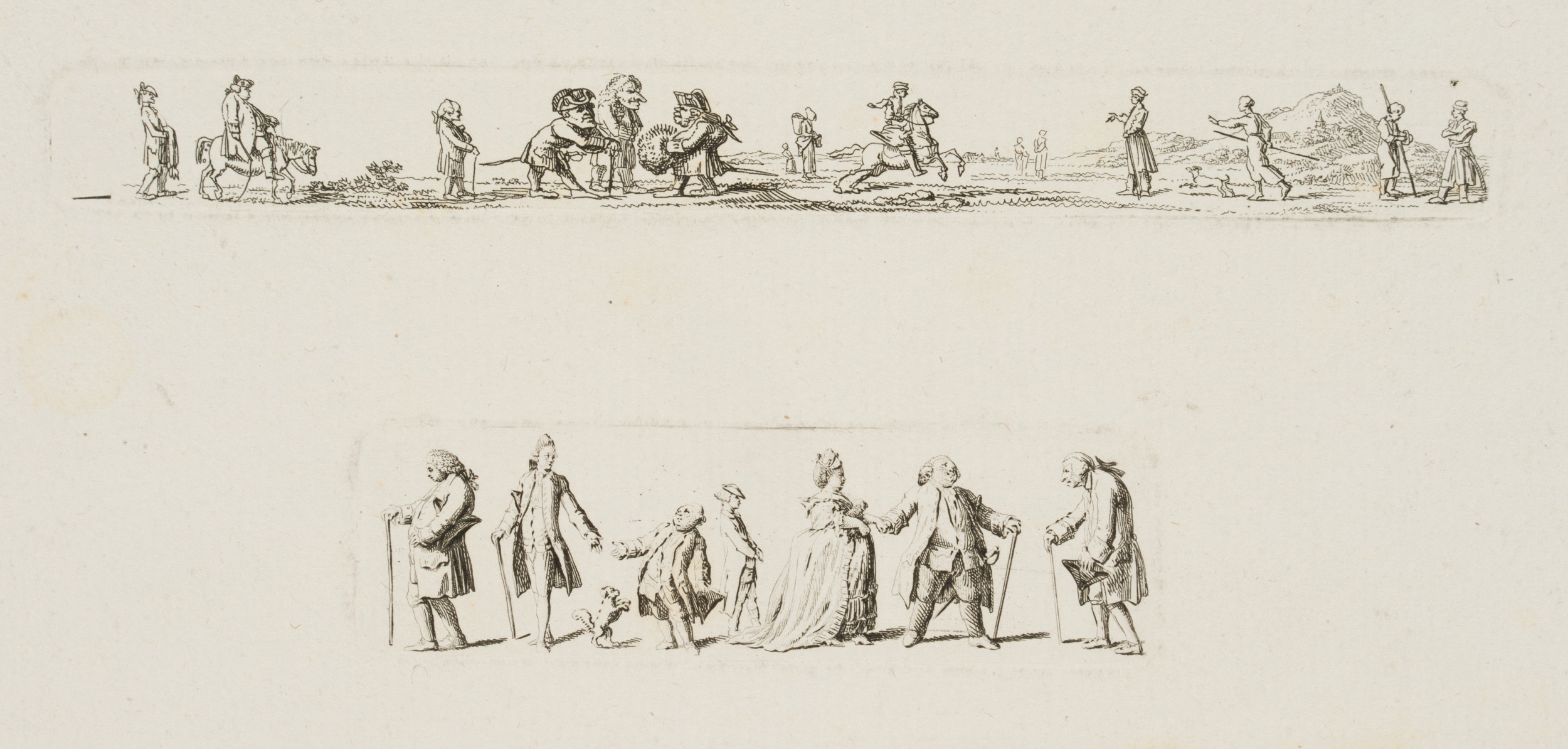 Daniel Nikolaus Chodowiecki (1726 Danzig – 1801 Berlin), Satirische Randeinfälle, Carricaturen I und Carricaturen II, 1775, Radierung