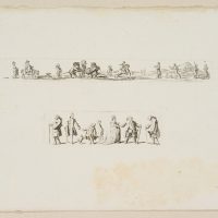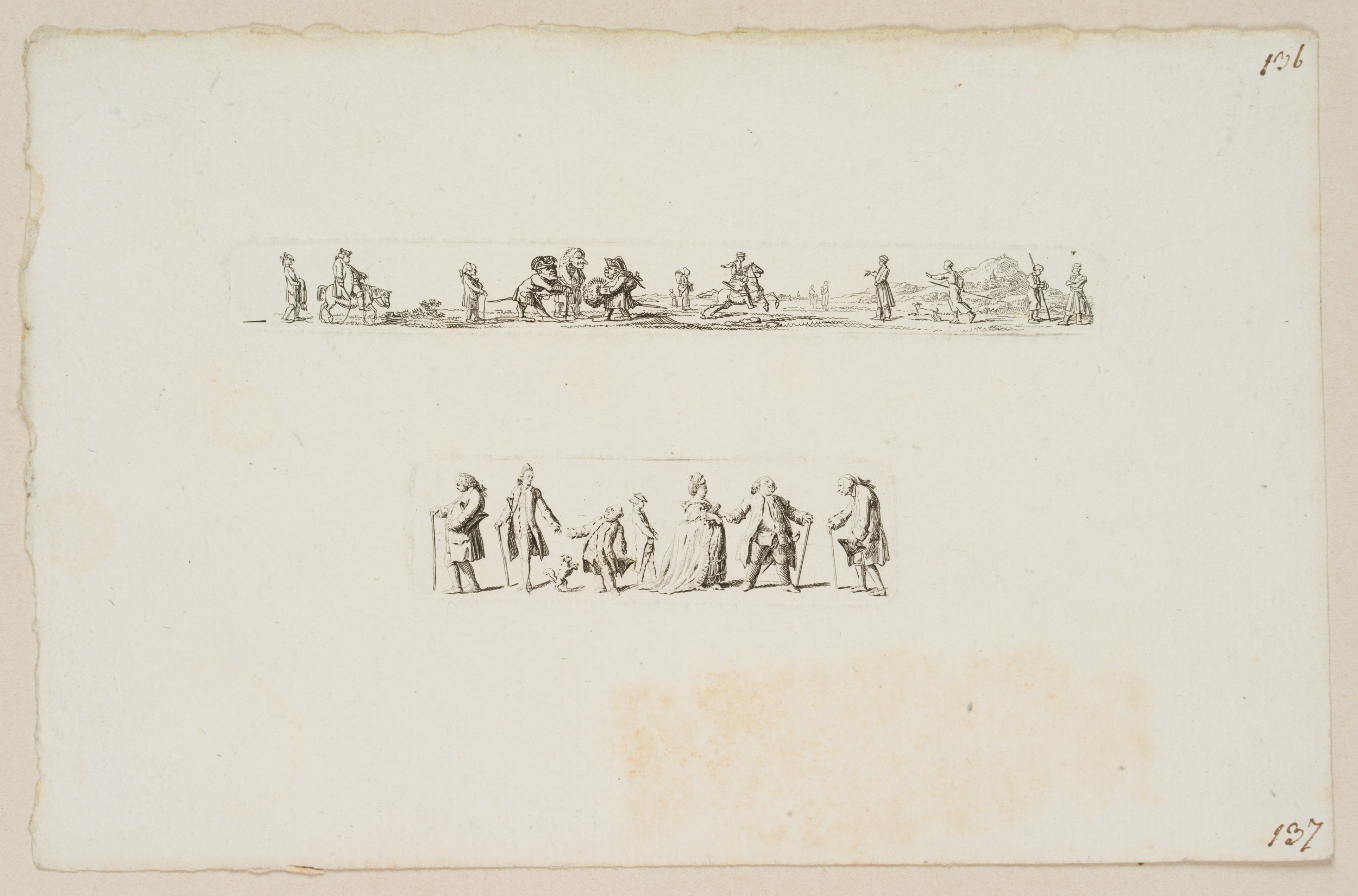 - Description: Two plates printed on one sheet of paper. Above “Carricatures I” (Engelmann 136), below “Carricatures II” (Engelmann 137). Showing some figures with caricaturing features. In the lower print, according to Engelmann, satirical depictions of well-known personalities of the time.