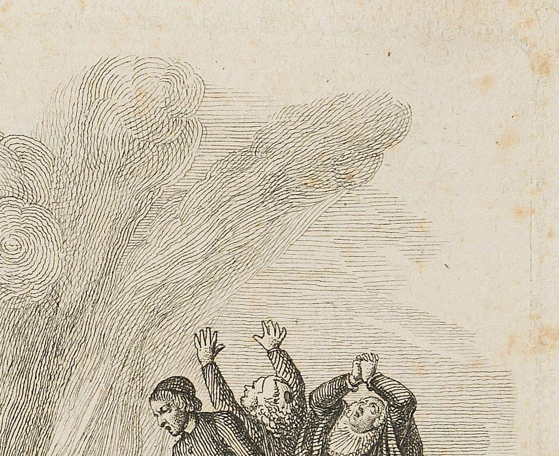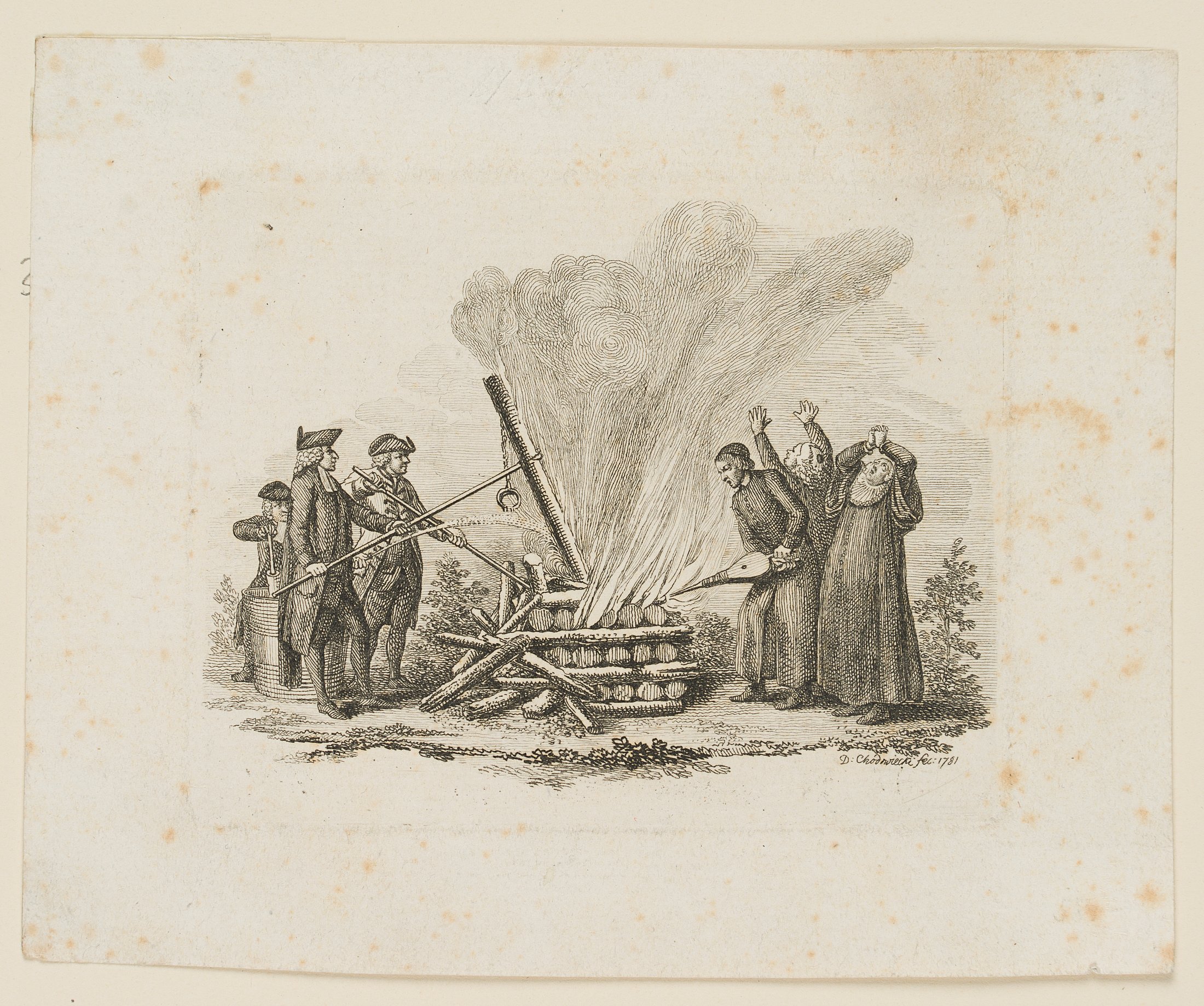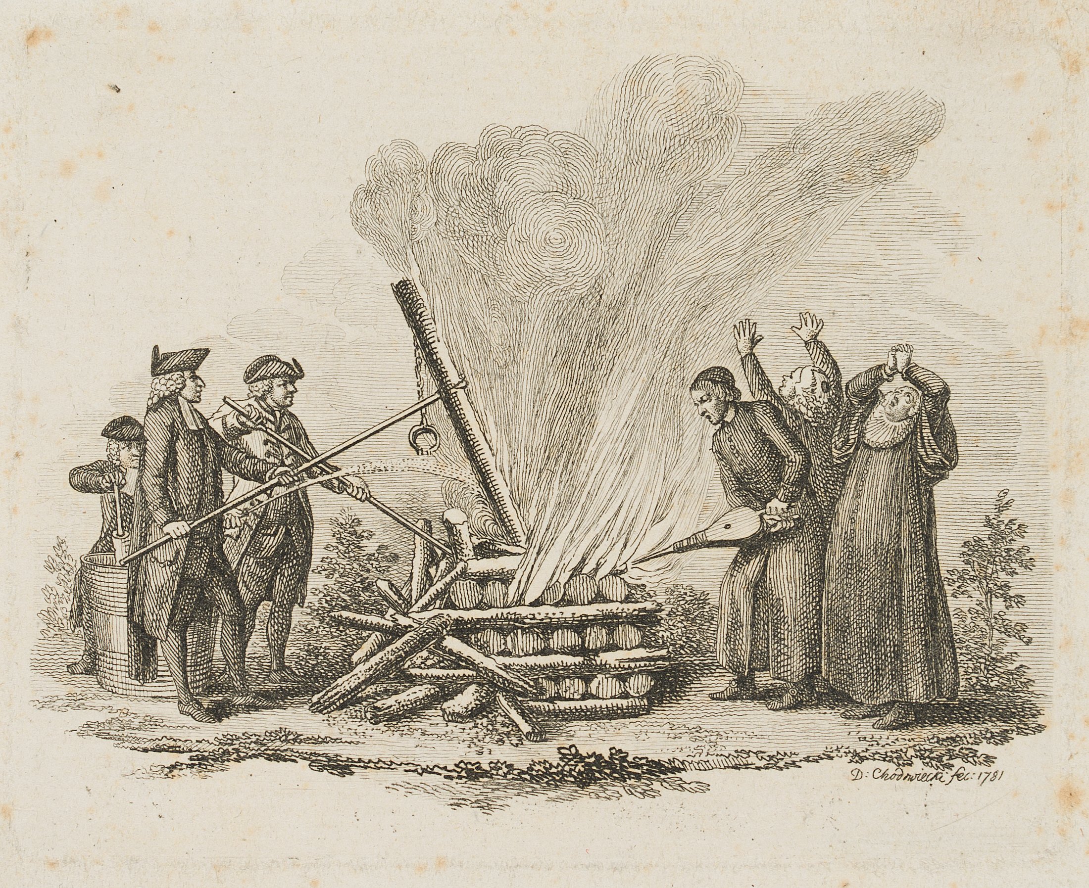 Daniel Nikolaus Chodowiecki (1726 Danzig – 1801 Berlin), Theologischer Diskurs am Scheiterhaufen, 1781, Radierung