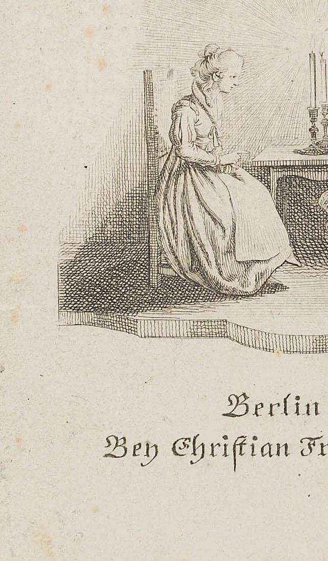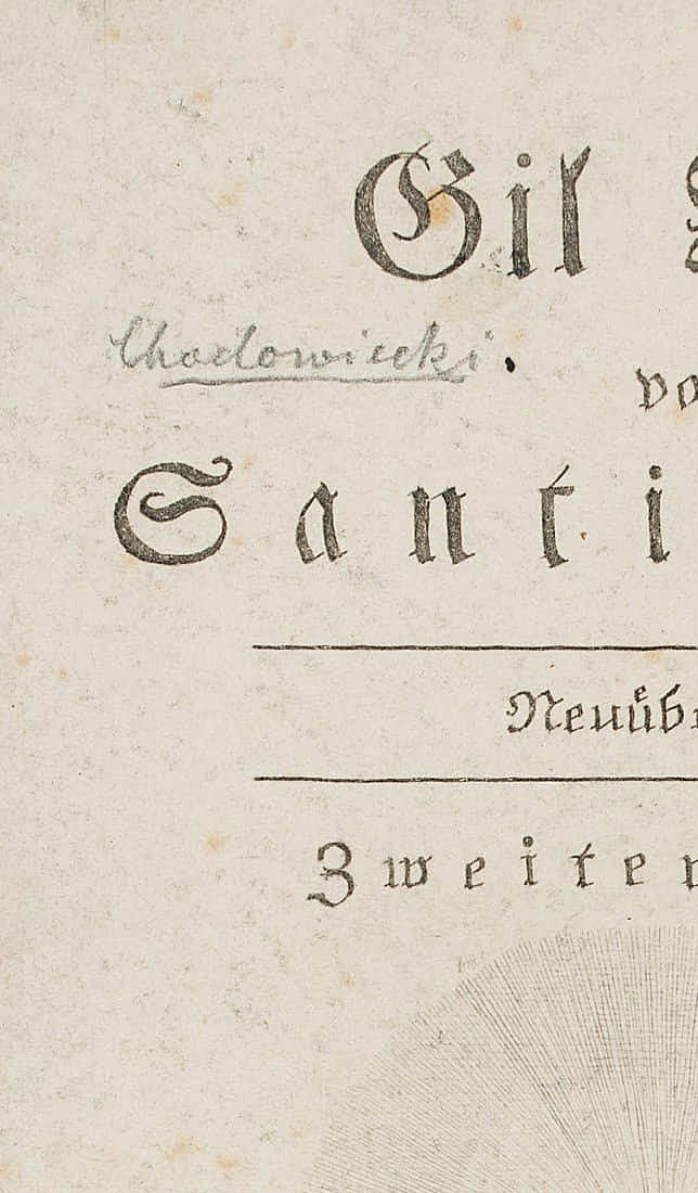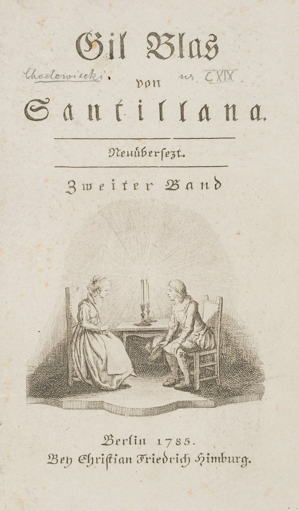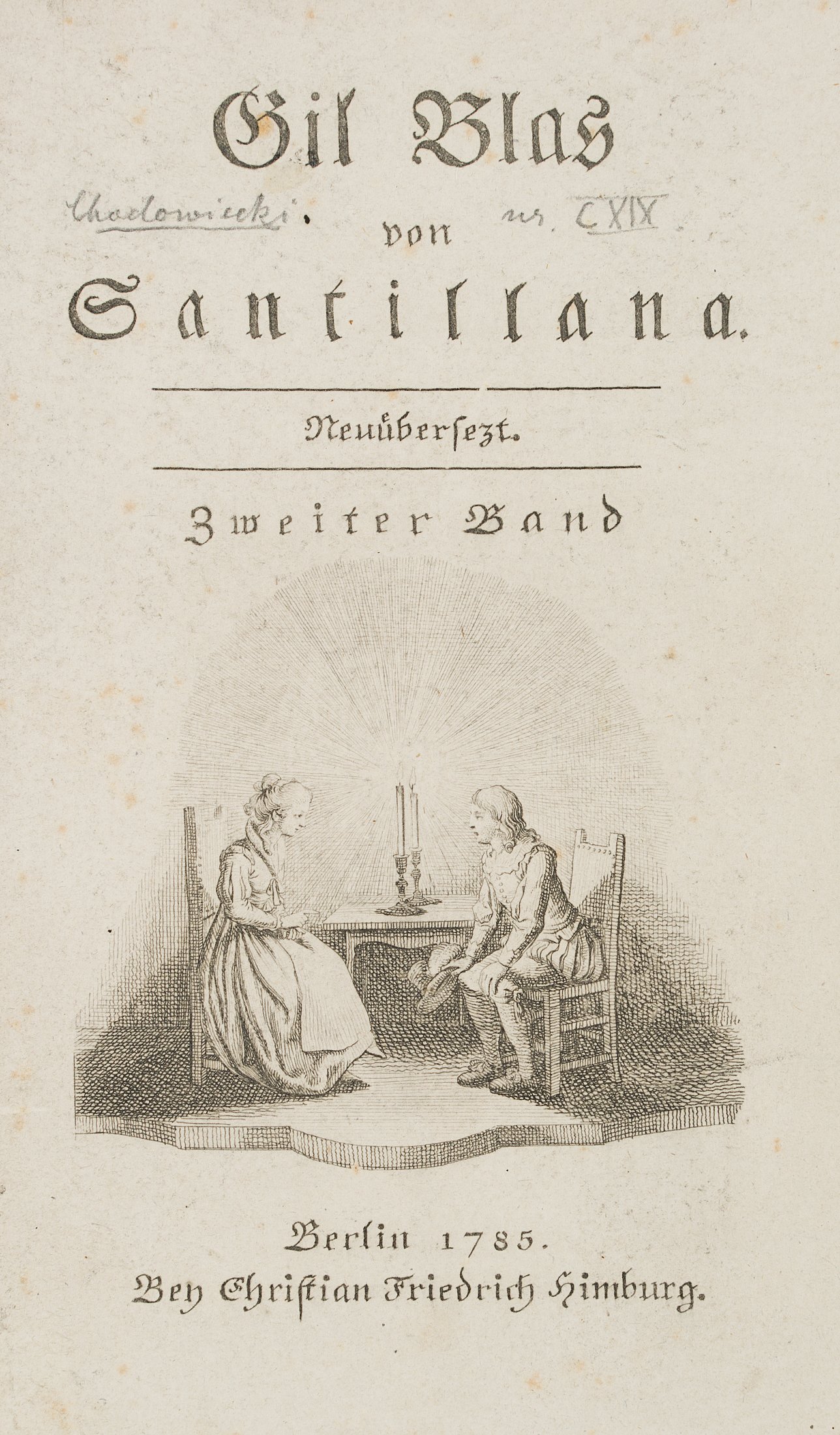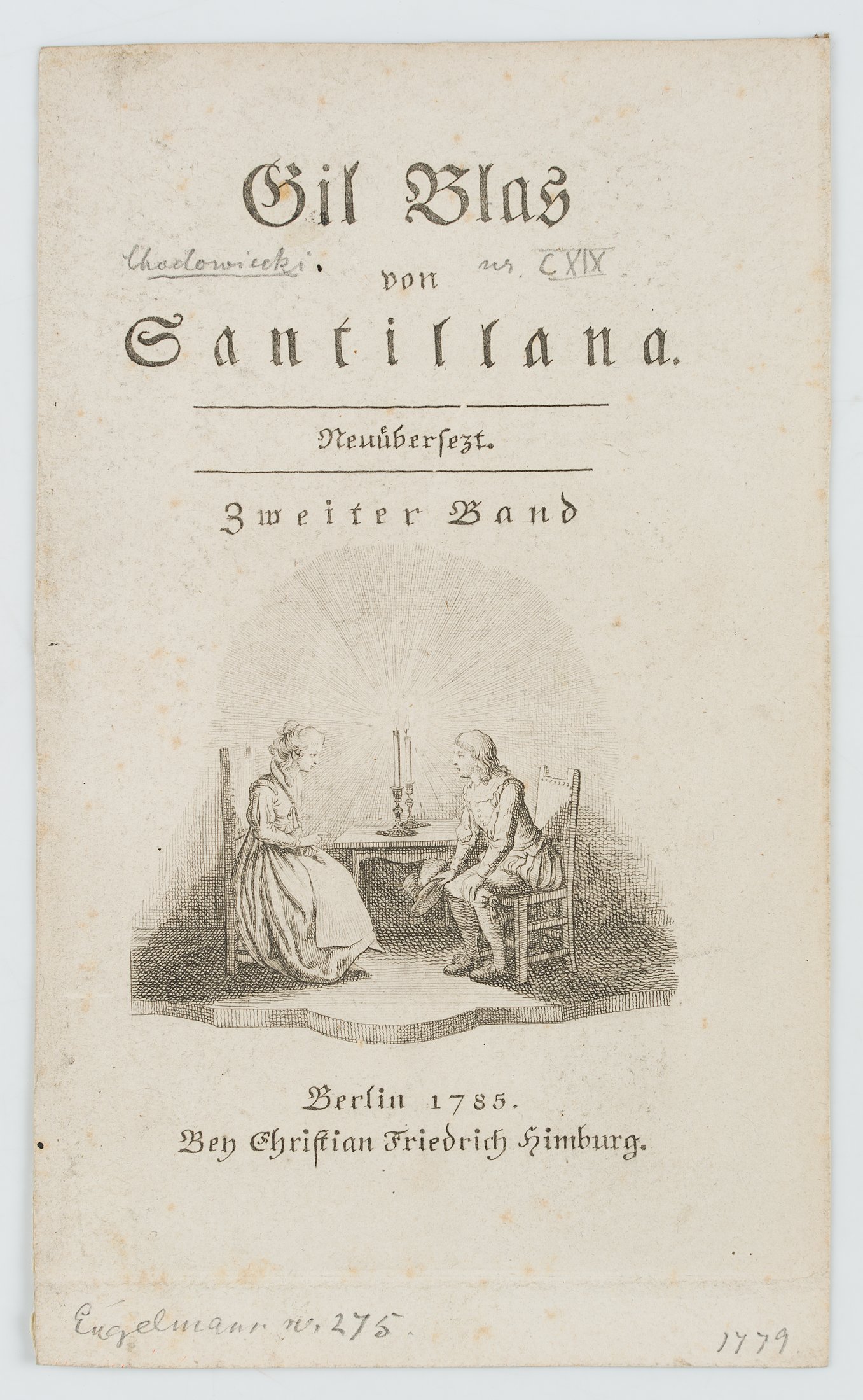 - Beschreibung: Gil Blas und Aurora bei nächtlichem Kerzenschein. Titelseite der zweiten Auflage des zweiten Bandes von 1785.