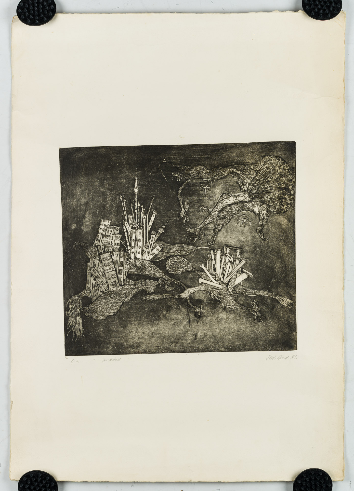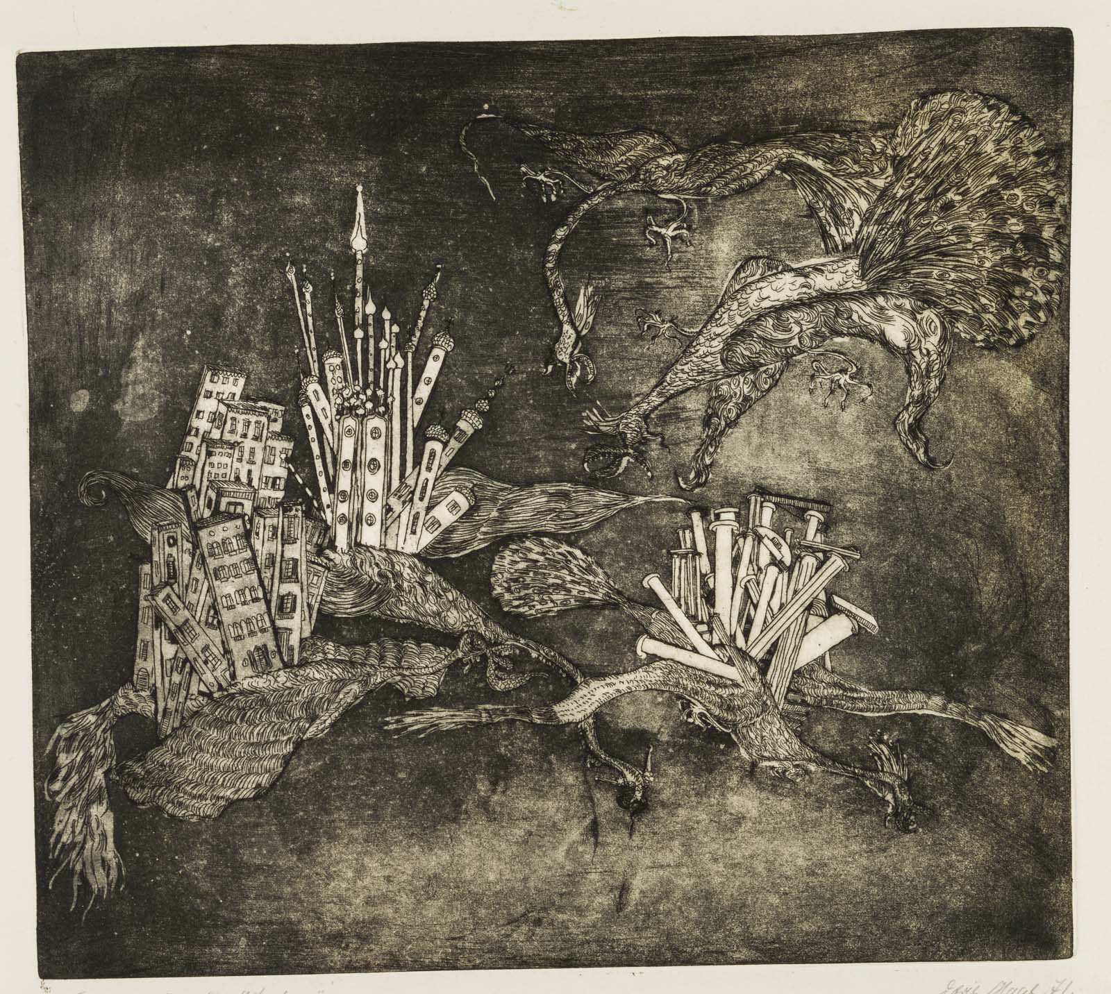 Doris Distelmaier-Haas (*1943 ), ‘Stadttod’ – Surrealisische Darstellung mit phantastischen Ungeheurn, die Bestandteile einer Stadt auseinanderreißen, 1971, Radierung