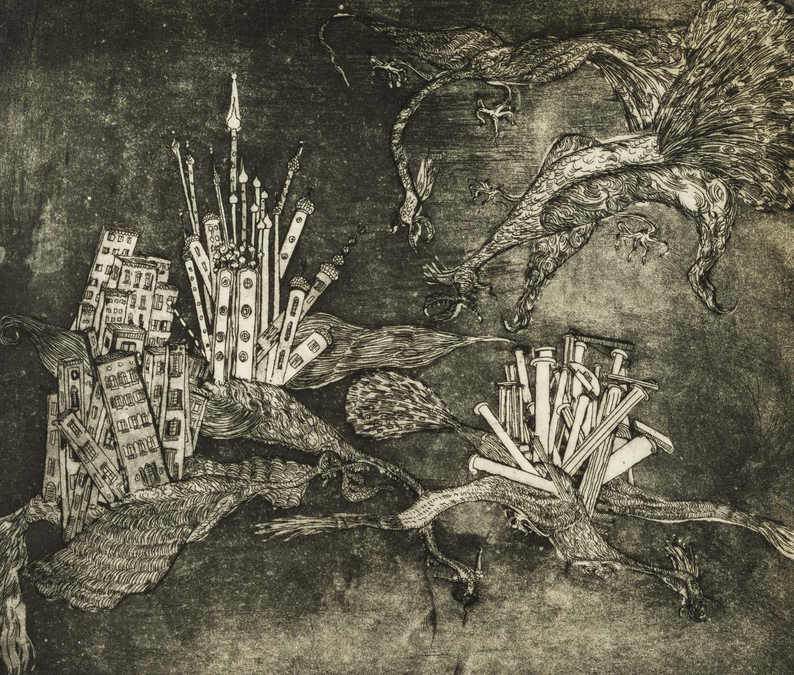 • Description: Doris Haas lives as a freelance artist and art lecturer in Bonn and belongs to the association of visual artists ‘Künstlergruppe Bonn’. This print shows a surrealistic, floating, black space in which monstrous mythical creatures tear apart a city and carry away its elemental components such as coils, houses and towers with onion caps.