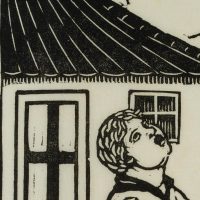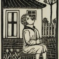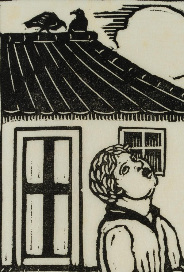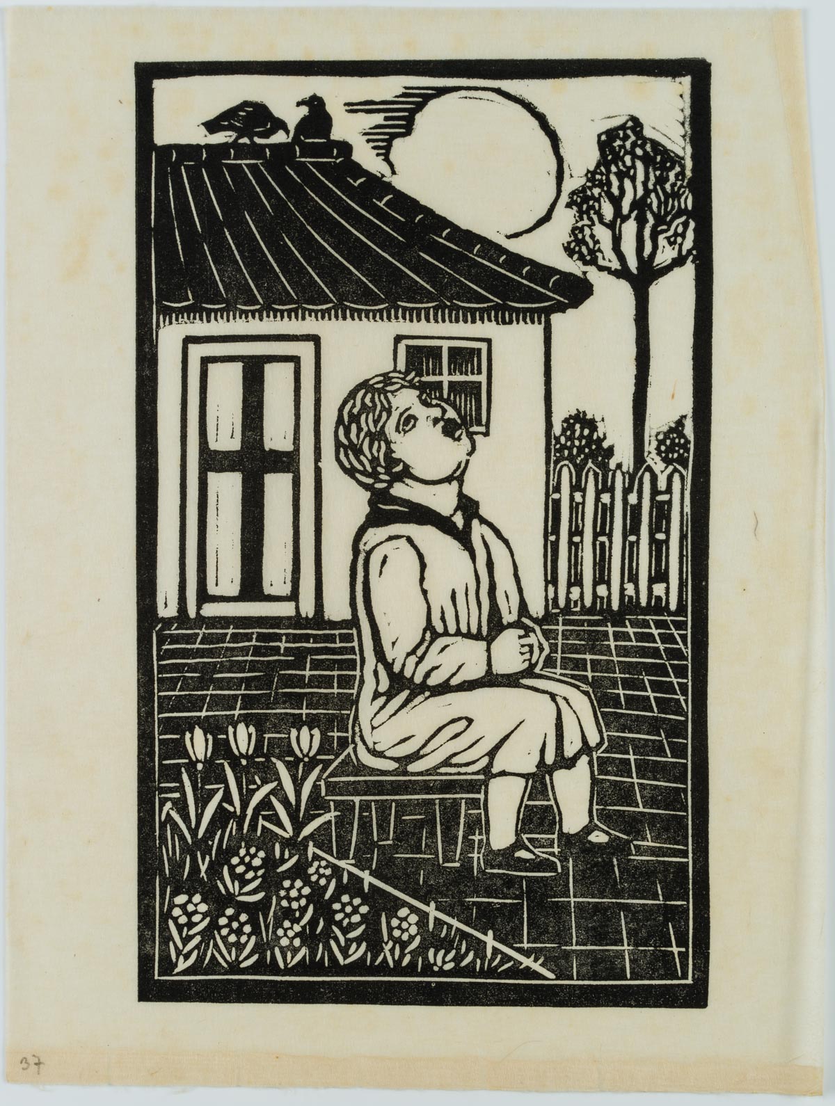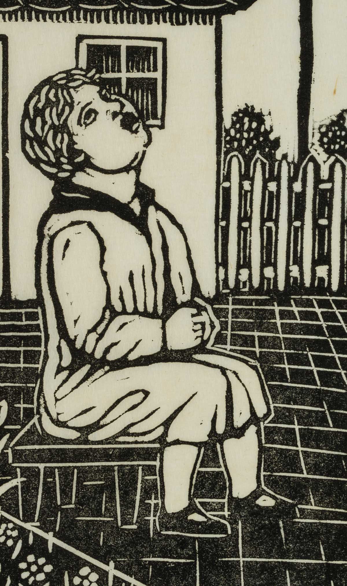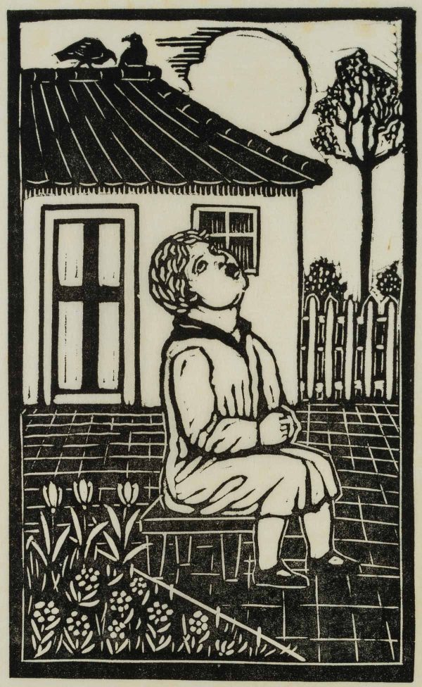 - Description: Without designation. In the courtyard of a house, sitting in front of a small flowerbed, the viewers see a child on a bench, his hands in his lap. His head is turned towards the sky and his mouth is wide open. Two ravens sit on the roof ridge in the background. Born in 1872 as the son of a preacher’s family with many children, Daniel GREINER attended the sculpture school in Berlin and Paris after studying philosophy. From 1903-1906 he was a member of the Darmstadt artists’ colony, after that he settled in Jugenheim with his own workshop. GREINER worked as a sculptor, medallist, graphic artist and writer. His best-known work is probably the “Greiner Bible”, which takes up themes from the Old and New Testaments in 147 woodcuts.