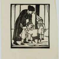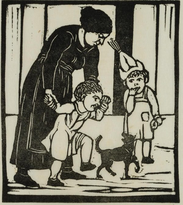 - Description: Without title. Street scene with two children and a woman holding one of the children’s hands while he tries to walk. A small black dog runs barking in front of him, while another child shyly watches the scene. Born in 1872 as the son of a preacher’s family with many children, Daniel GREINER attended the sculpture school in Berlin and Paris after studying philosophy. From 1903 to 1906 he was a member of the Darmstadt artists’ colony, after which he set up his own workshop in Jugenheim. GREINER worked as a sculptor, medallist, graphic artist and writer. His best-known work is probably the “Greiner Bible”, which takes up themes from the Old and New Testaments in 147 woodcuts.