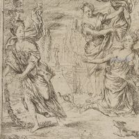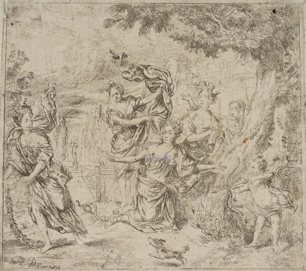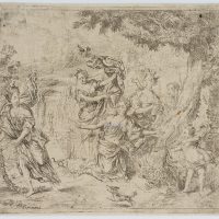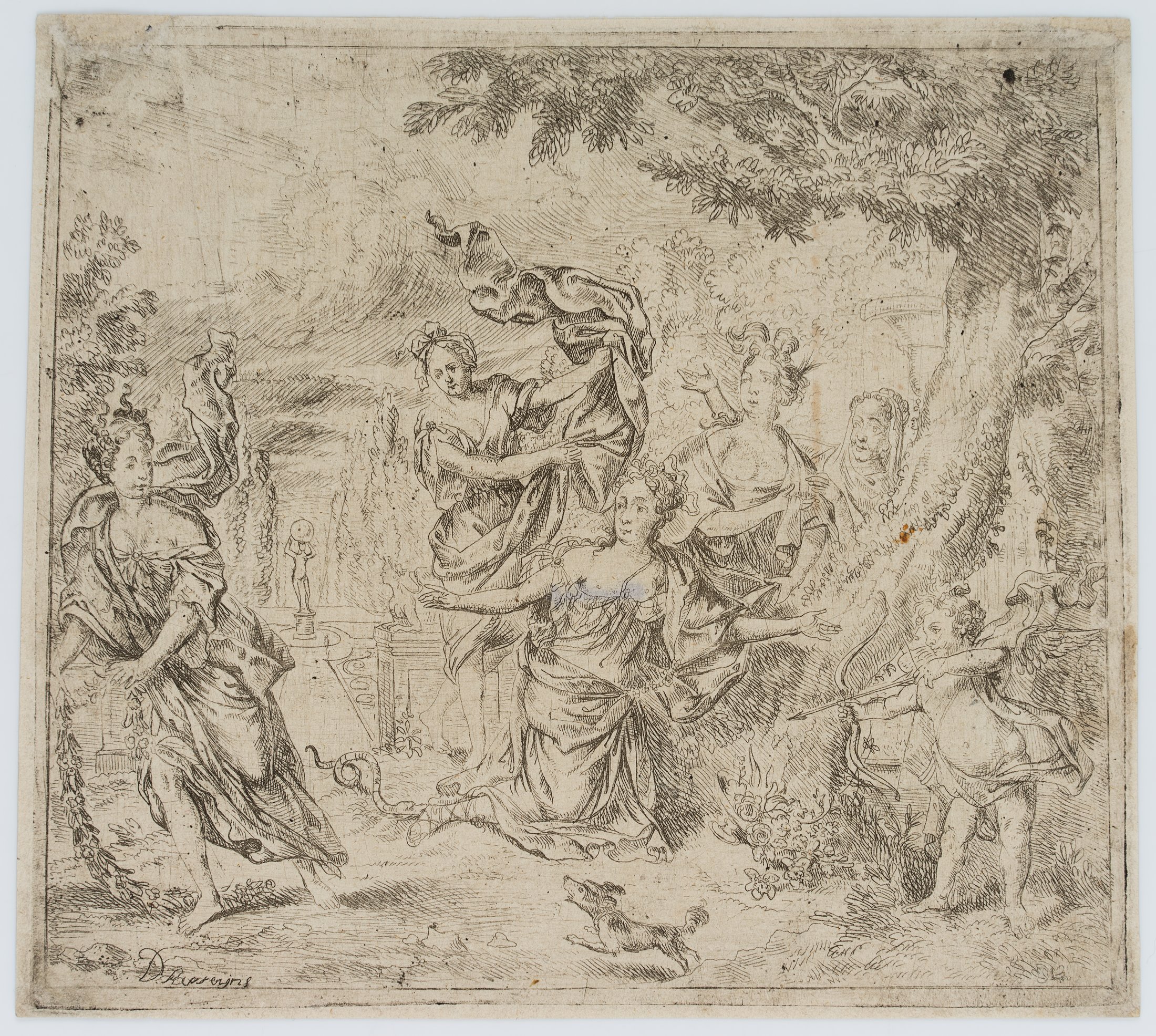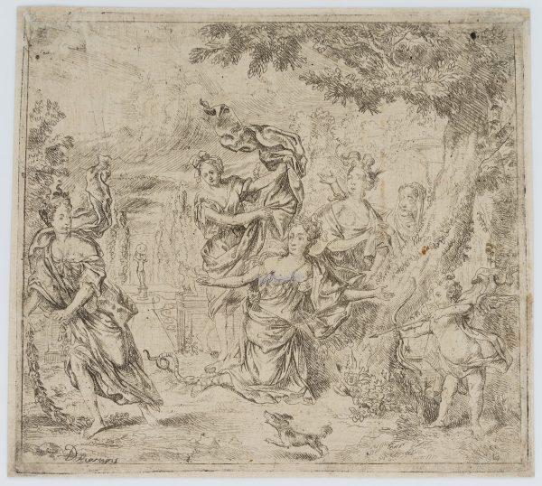 - Description: Lively scene with a view of a landscape garden. Five female figures move expressively in the foreground in wrinkled antique robes. The one kneeling in the centre is bitten on the heel by a snake, on the left a figure with a wreath of flowers flees from the unhappy bride. On the right stands Cupid with bow and arrow, aiming at the snake. Possibly a humorous allegory of a bride afflicted by misfortune.