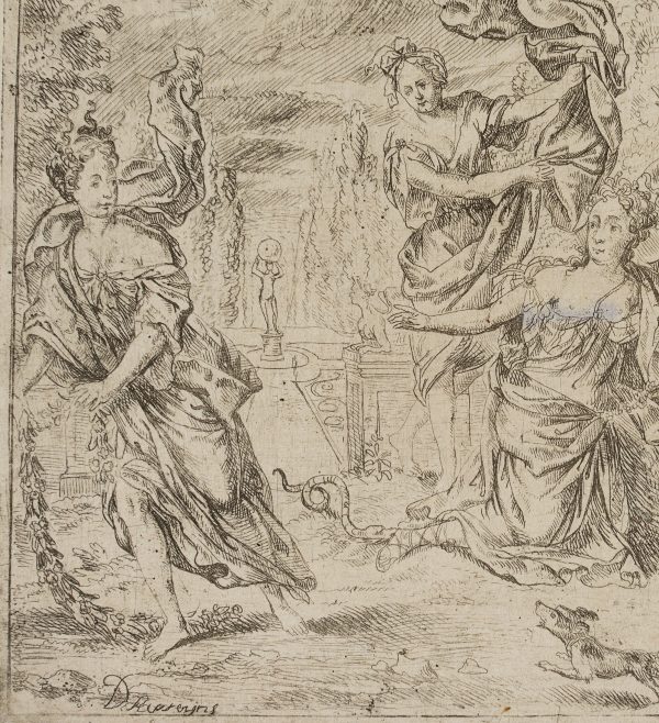 Daniel Herreyns (*1678 Antwerpen), Gartenszene mit weiblichen Allegorien, um 1700, Radierung