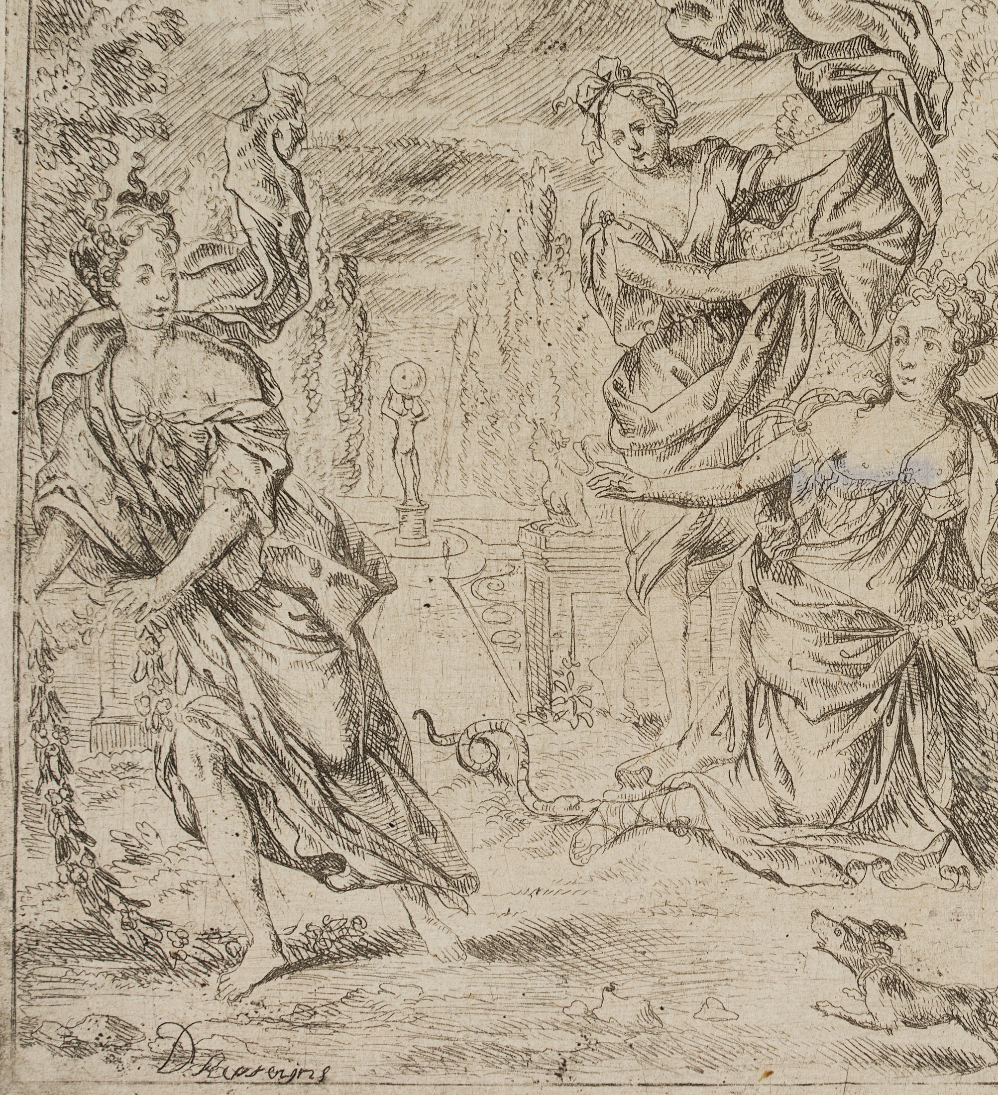 Daniel Herreyns (born 1678 Antwerp), Garden Scene with Female Allegories, c. 1700, Etching