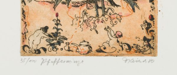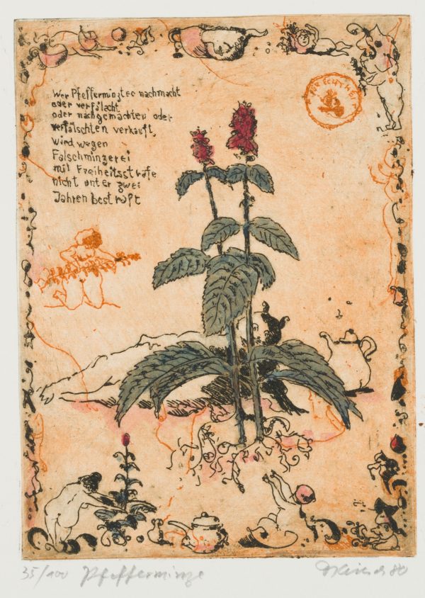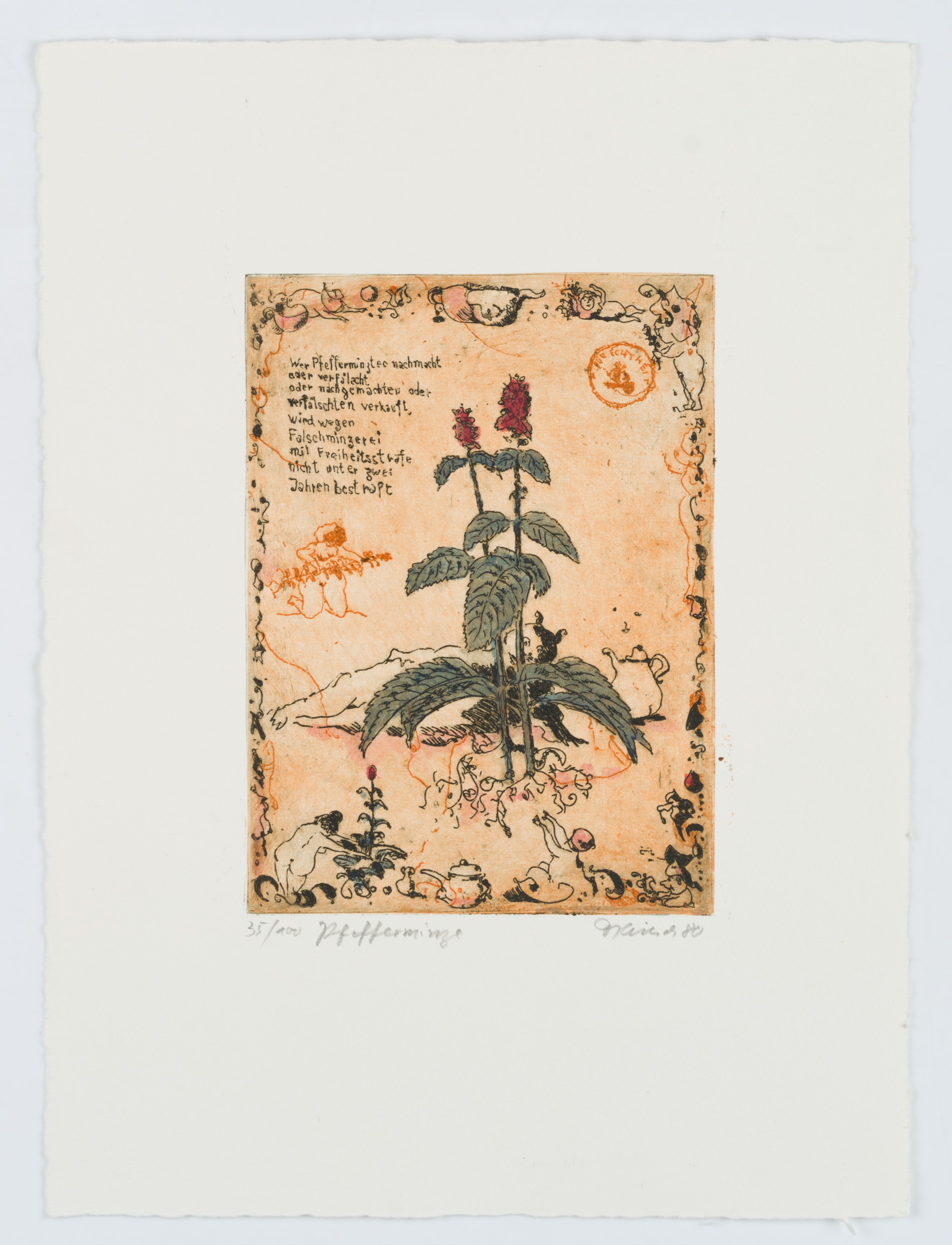Dieter Kliesch (1926 Daun – 2013 ), Pfefferminze. Humorvolle botanische Darstellung II., 1980, Radierung