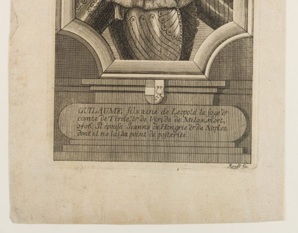- Inscription: Lower right signed in the printing plate: “Krafft fec.”. Lower middle inscribed in the printing plate: “Guilaume fils ainé de Leopold le Sage comte de Tirole, de Viride de Milan, mort 1406. Il épousa Jeanne de Hongrie de Naples dont il ne laissa de posterité.”.