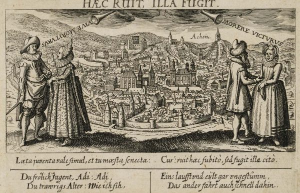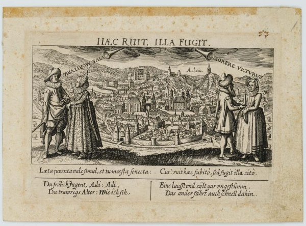 Oberhalb der Darstellung bezeichnet: “HAEC RUIT, ILLA FUGIT”. Darunter Gedanken zum Alter und zur Jugend in lateinisch und deutsch. Stadtansicht von Aachen mit Emblemszene und Sinnspruch. Tafel D79 aus dem Werk “Thesaurus philopoliticus” (Deutscher Titel: “Politisches Schatzkästlein”). Es ist eine Sammlung von Kupferstichen bzw. Radierungen mit Veduten, die Daniel Meisner als Poeta laureatus und Eberhatd Kieser als Kupferstecher und Verleger ab 1623 in Frankfurt am Main veröffentlichten. Aufbau der Drucke: Die Blätter des ‘Thesaurus philopoliticus’ kombinieren einen Abbildungs- und einen Textteil nach einem einheitlichen Konzept. Oberhalb des Bildes ist ein Sinnspruch oder Motto, meist in lateinischer Sprache, angebracht.