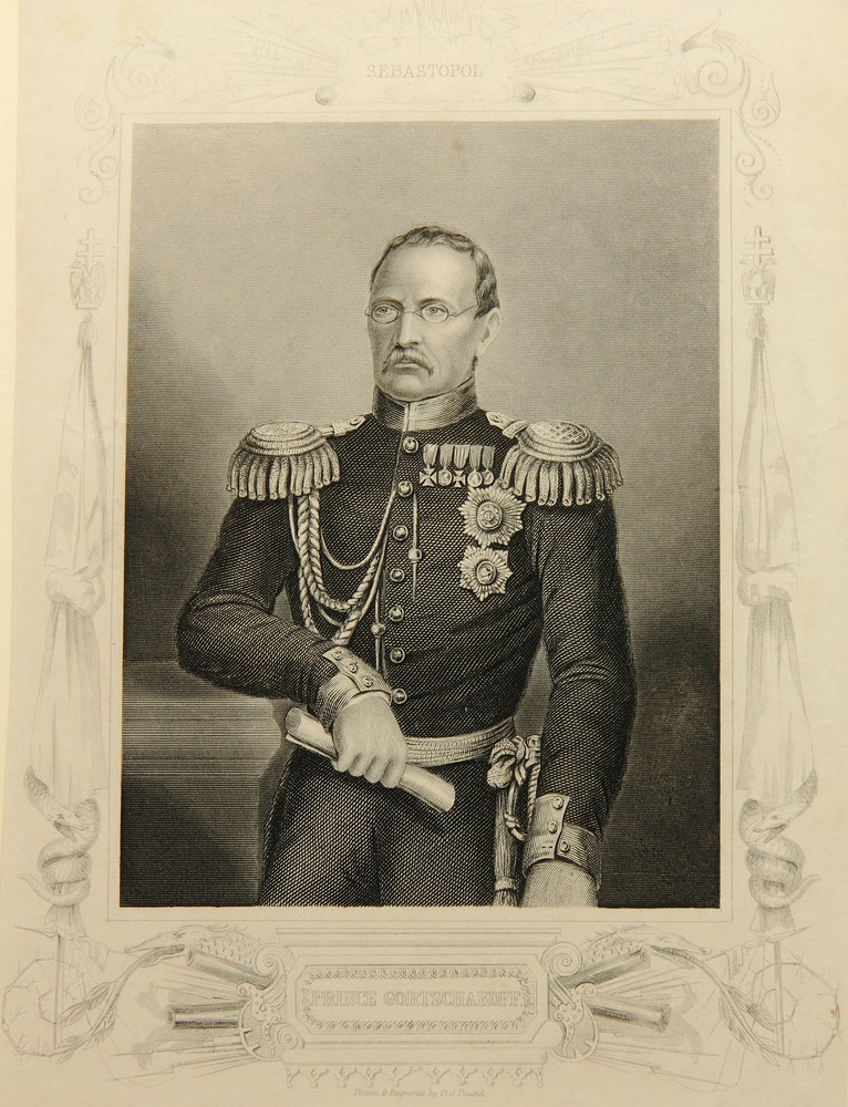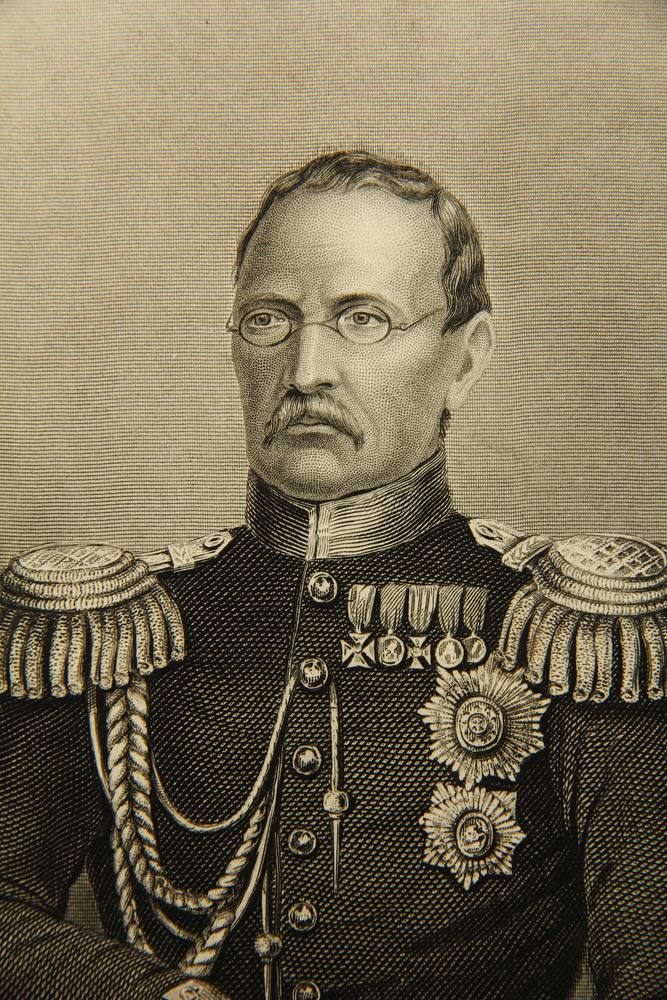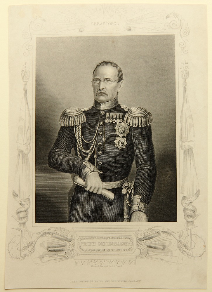 - Bezeichnung: Unterhalb der Darstellung in der Druckplatte vom Künstler signiert sowie mit dem Namen des Dargestellten betitelt. Oberhalb mit “Sebastopol” bezeichnet, das der Dargestellte 1855 gegen die alliierten Truppen von Engländern und Franzosen verteidigte.