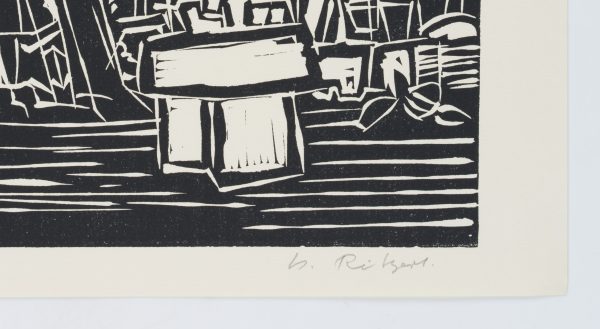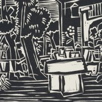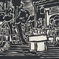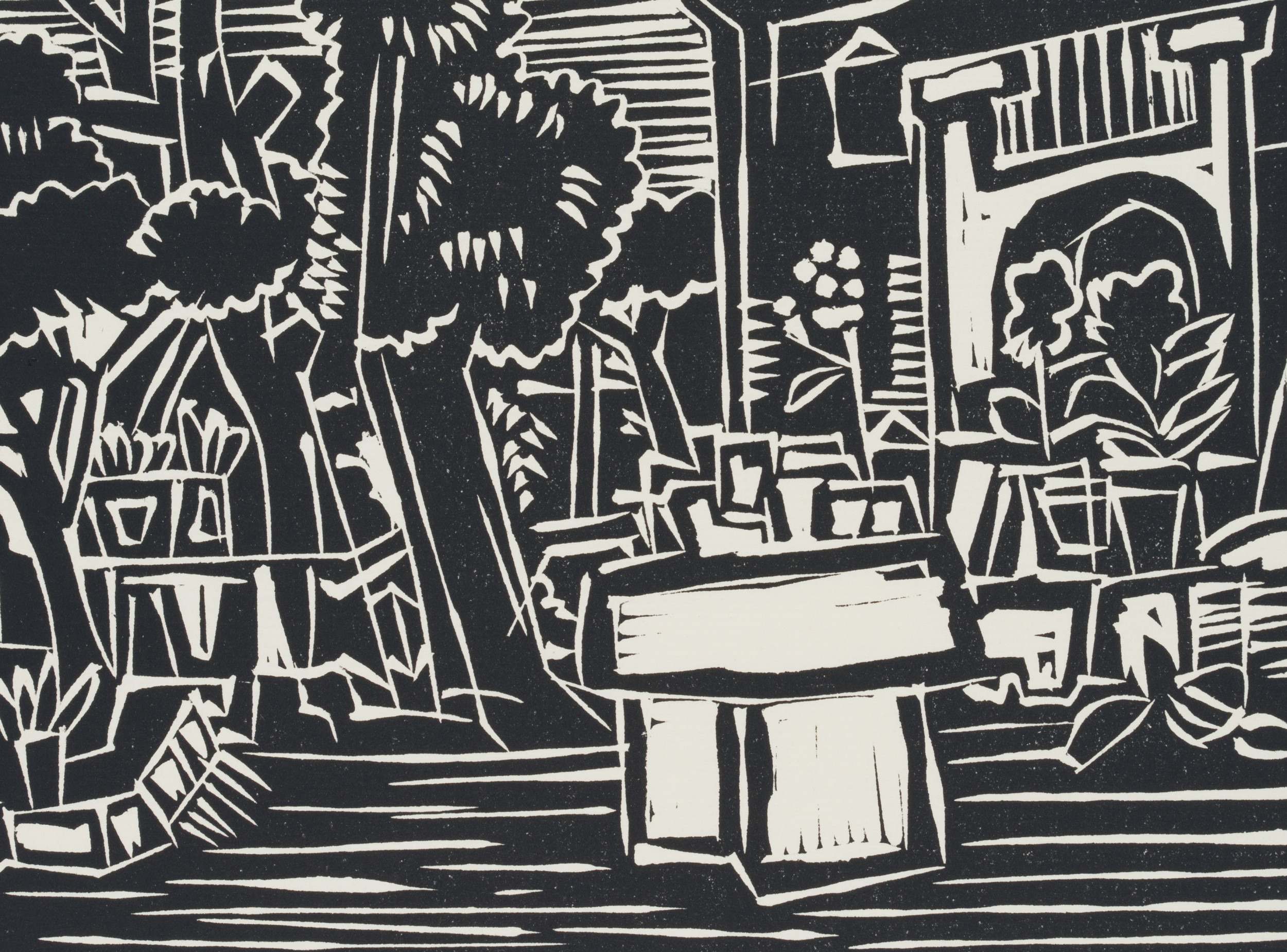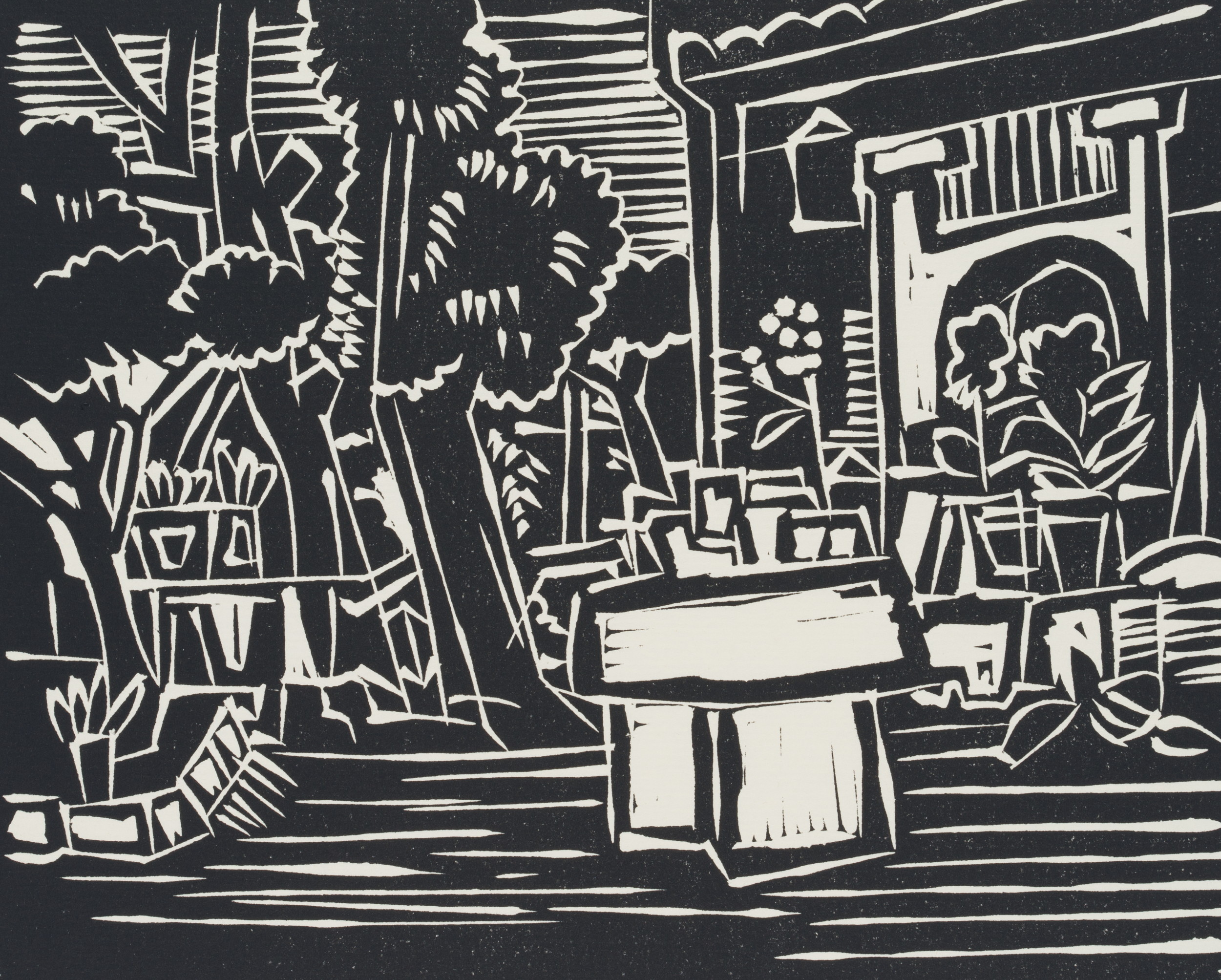 Diether Ritzert (1927 Kamen – 1987 Rüsselsheim), Casa Baldi. Blick auf Garten und Gebäude, um 1980, Linolschnitt