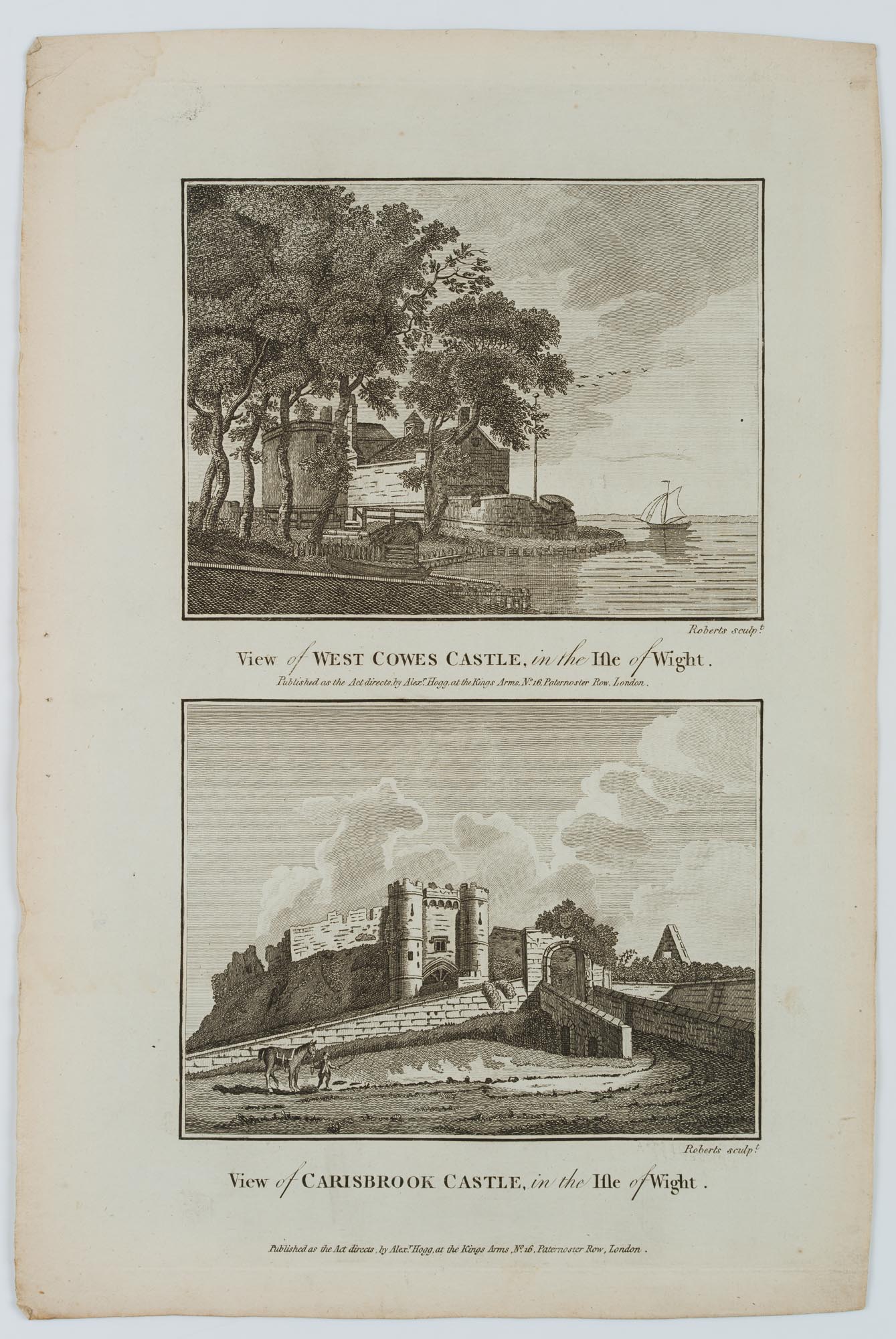 David Roberts (1796 Stockbridge near Edinburgh – 1864 London), Zwei Architektur- und Landschaftsdarstellungen: “View of West Cowes Castle, in the Isle of Wight”, “View of Carisbrook Castle, in the Isle of Wight”, 18th century, Etching