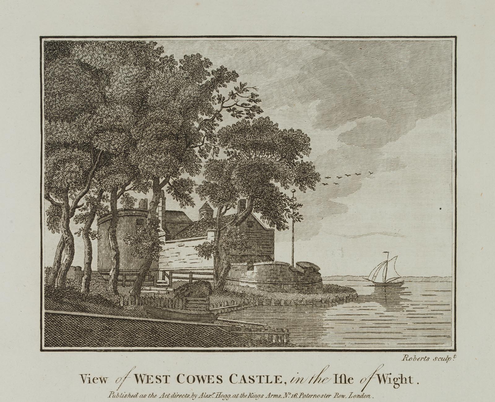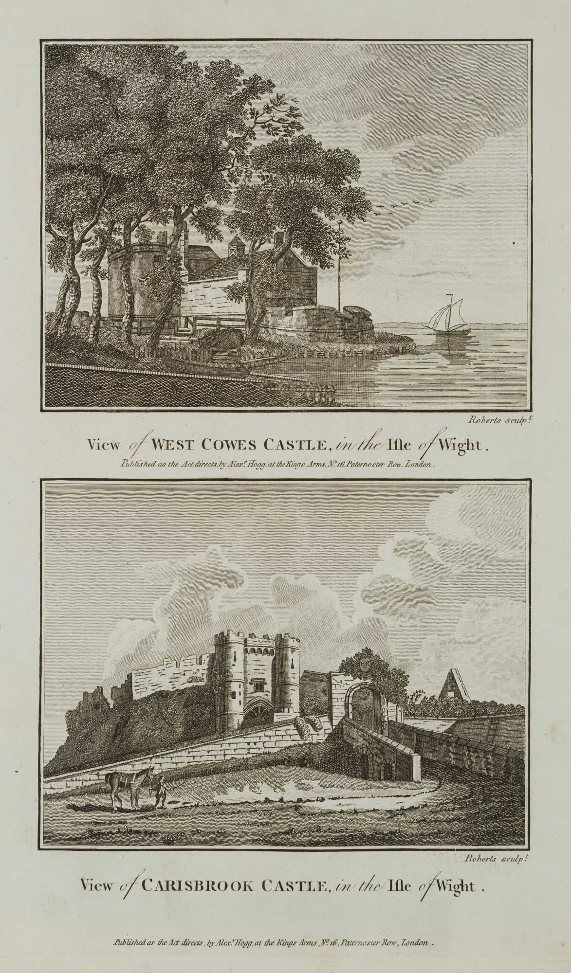 David Roberts (1796 Stockbridge bei Edinburgh – 1864 London), Zwei Architektur- und Landschaftsdarstellungen: “View of West Cowes Castle, in the Isle of Wight.”, “View of Carisbrook Castle, in the Isle of Wight”, 18. Jahrhundert, Radierung