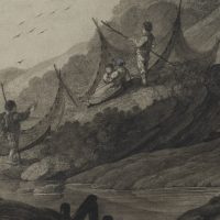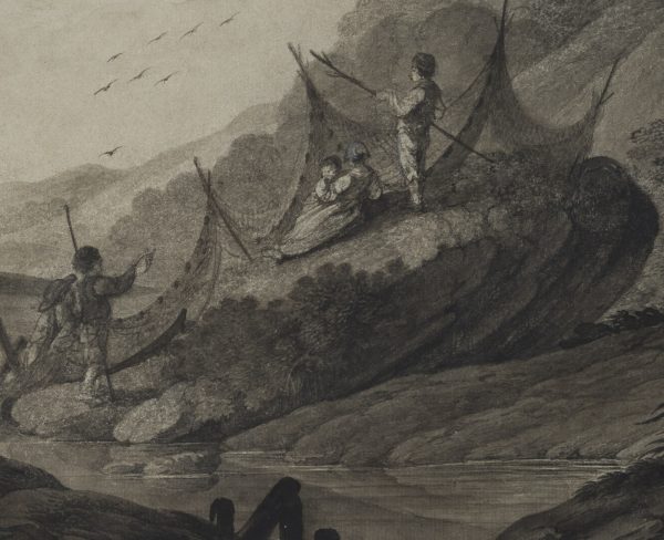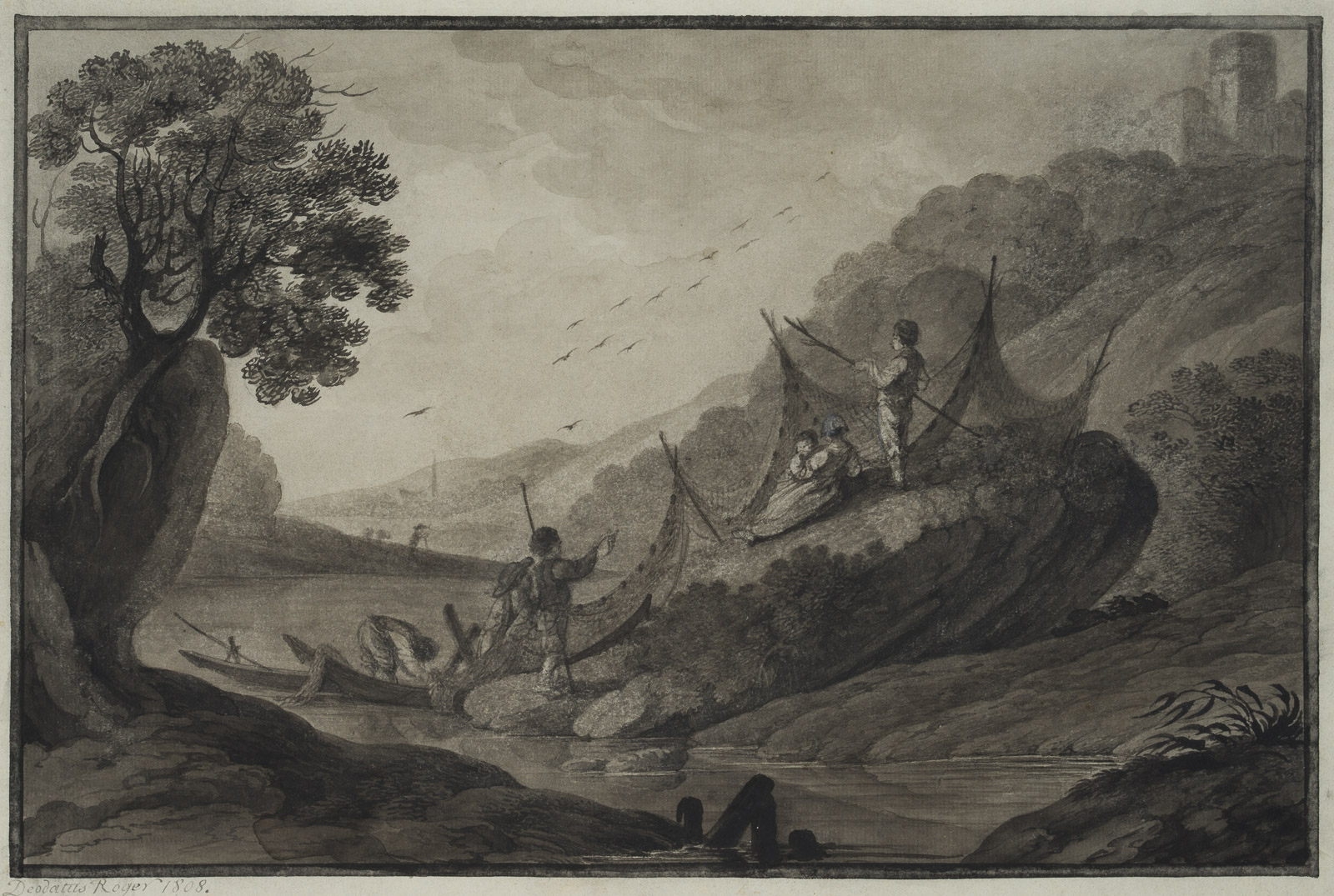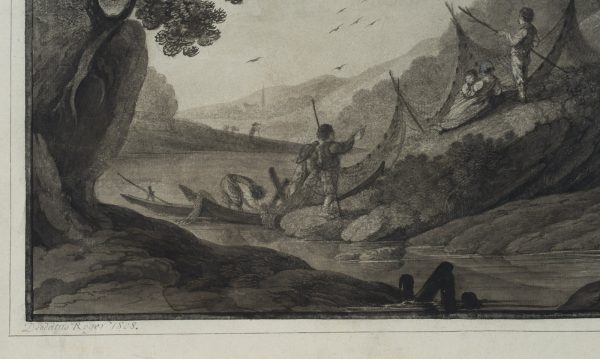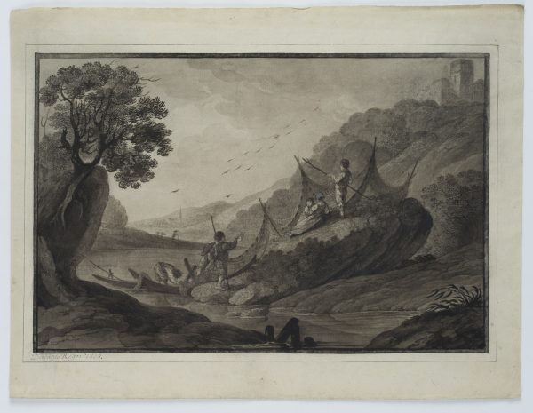 Deodat Roger (1726 – 1821 ), Landscape with anglers, 19th century, Indian ink