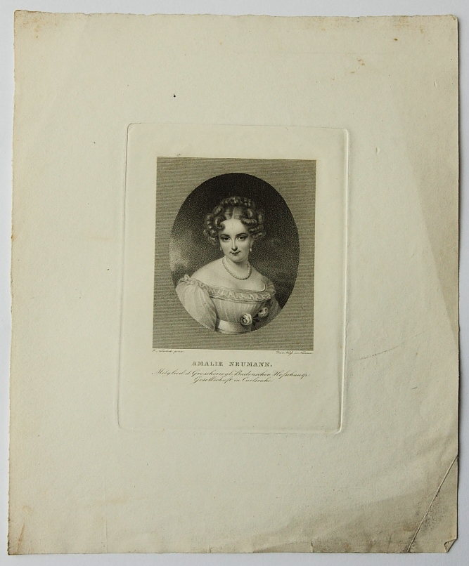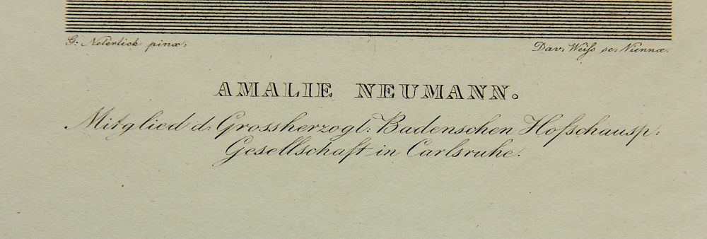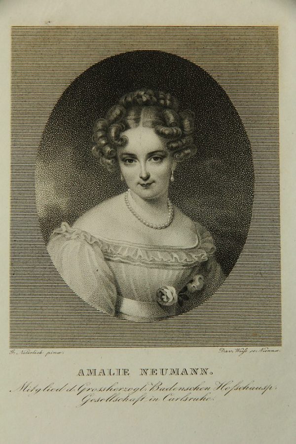 - Beschreibung: Amalie Neumann, Schauspielerin, Badischen Hofschauspielgesellschaft Karlsruhe. Lithographie auf festem Papier. Nach einem Gemälde von G. Neterlick. Unter der Darstellung im Druck beschriftet.