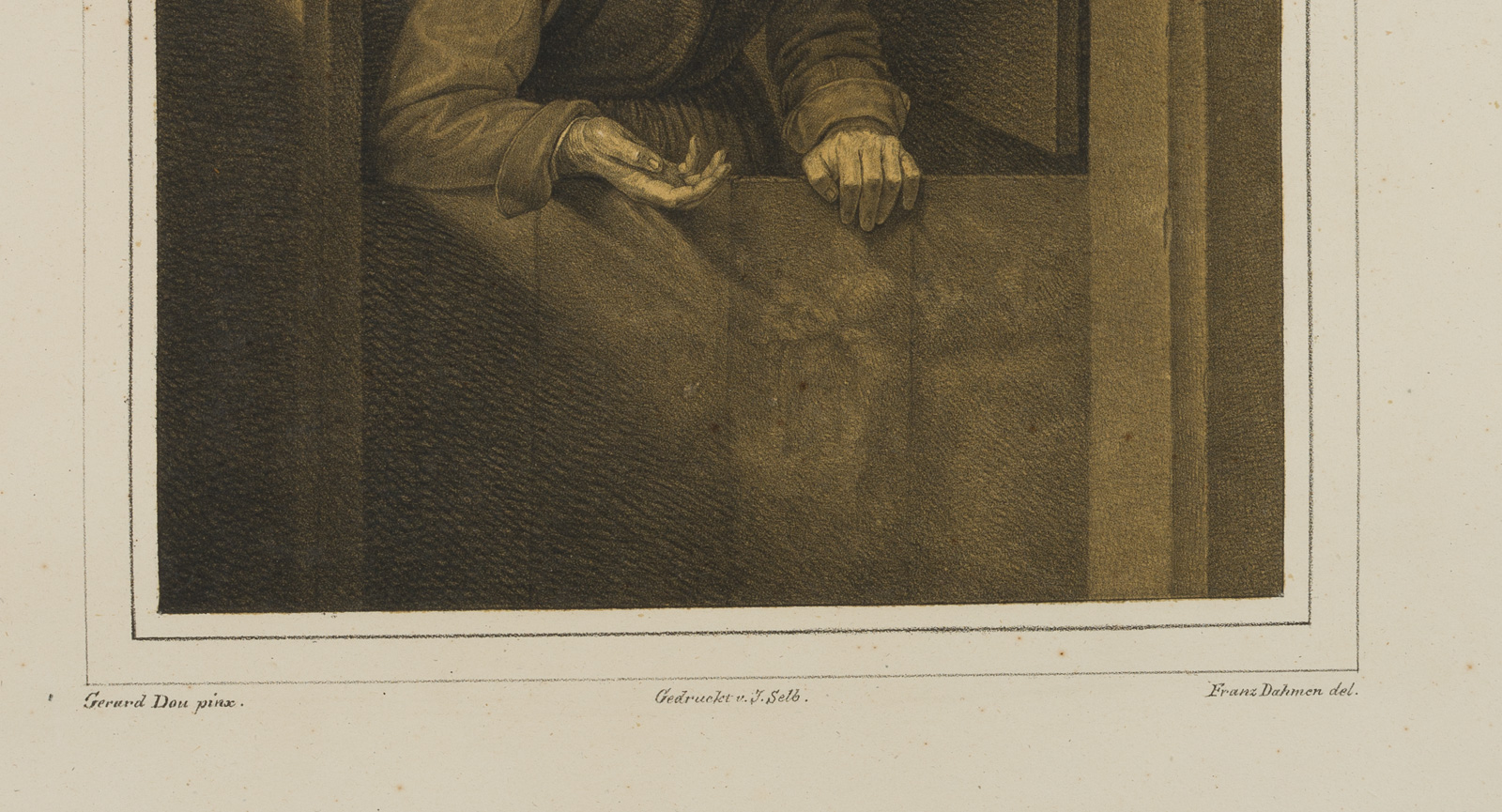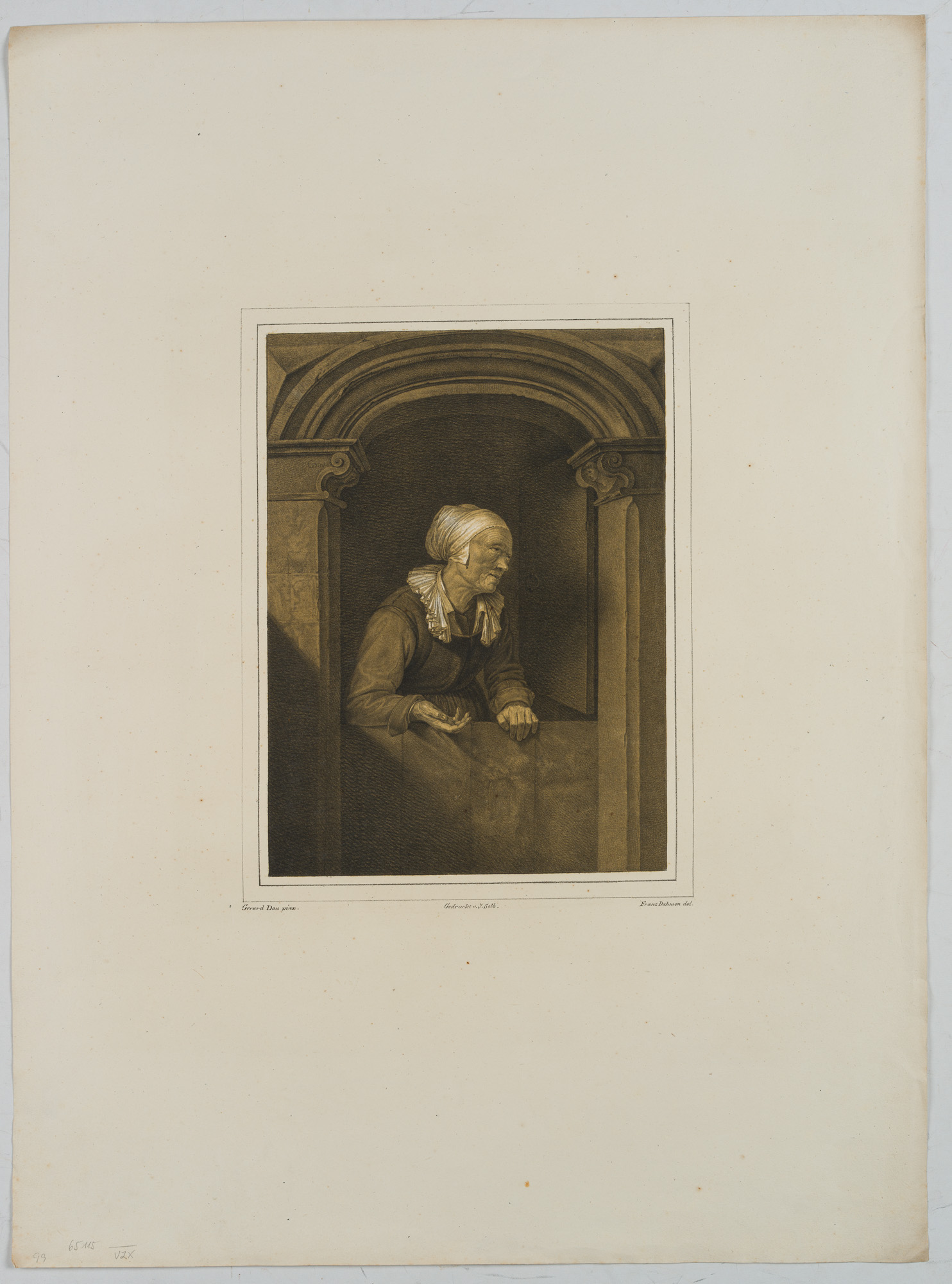 Franz Dahmen (1790 – 1865 ibid.) after Gerard Dou (1613 – 1680 ), Begging old woman under a column arch, 19th century, Lithography with chalk