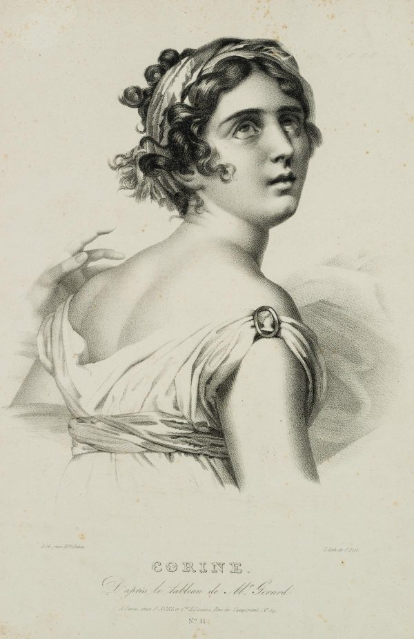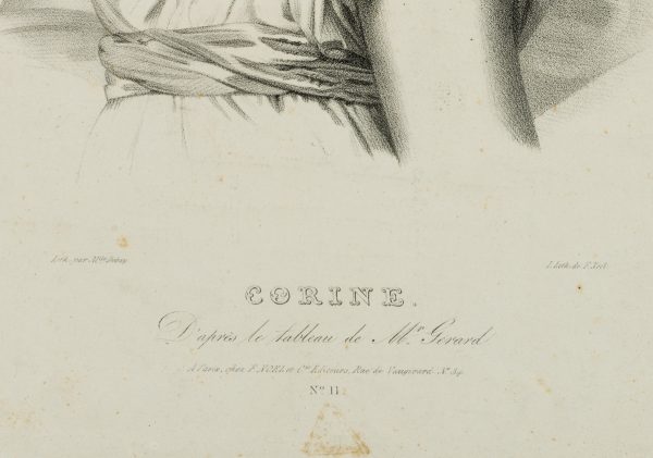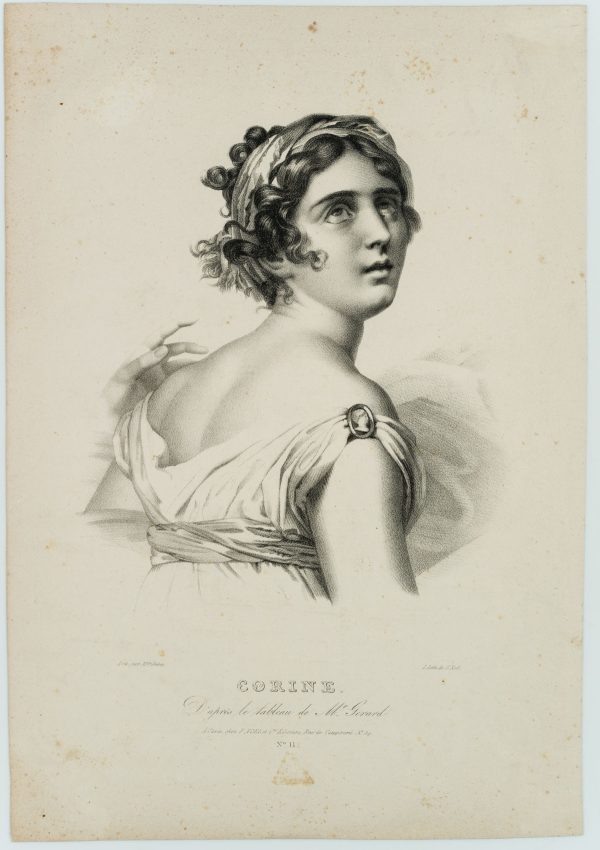 - Description: inscribed “Lith. Par. M.lle Debay”, “L.Lith. De F. Noel”, titled “Corine/D’après le tableu de Mr. Gerard”. Portrait of a young woman in back view. The woman has her left arm slightly raised, while her gaze is directed towards the sky. Dark curls frame her face.