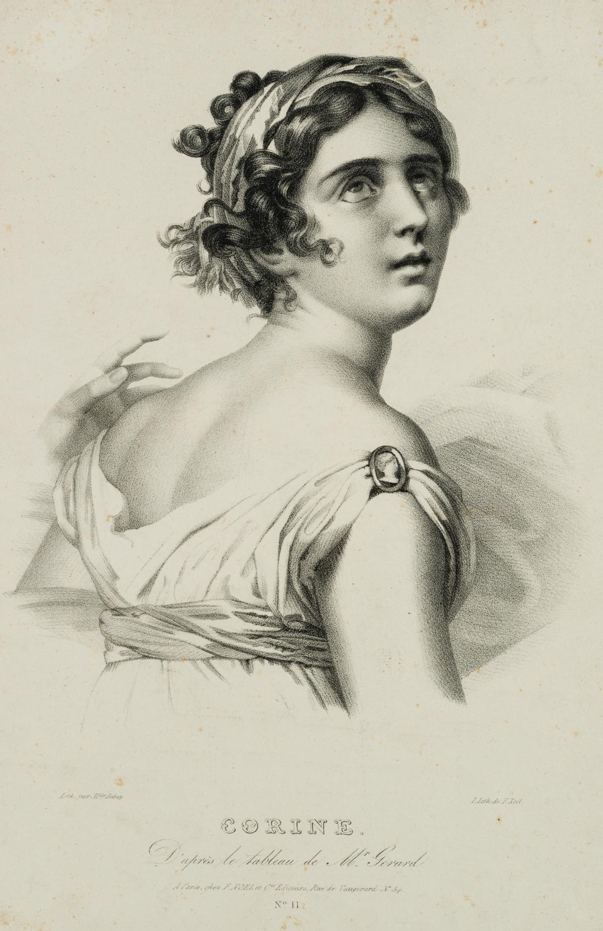 - Beschreibung: bezeichnet “Lith. Par. M.lle Debay”, “L.Lith. De F. Noel”, betitelt “Corine/D’après le tableu de Mr. Gerard”. Bildnis einer jungen Frau in Rückenansicht. Ihren linken Arm hat die Frau leicht erhoben, während ihr Blick gen Himmel geht. Dunkle Locken rahmen ihr Gesicht.